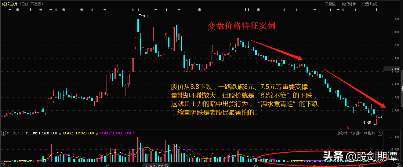 变盘的目的是为了清仓出货,走势特征相对温和,常见的手法就是以缓慢的速度下跌,并且成交量同步萎缩,好像跌不下去的感觉。