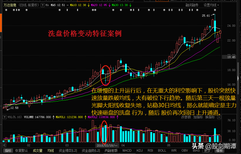 洗盘的目的是为了恐吓市场中的浮动筹码,在上升过程中,会出现毫无理由的快速、连续性的下跌,并且跌破重要趋势线,给人变盘的感觉,但随后又快速拉升,恢复上升趋势。