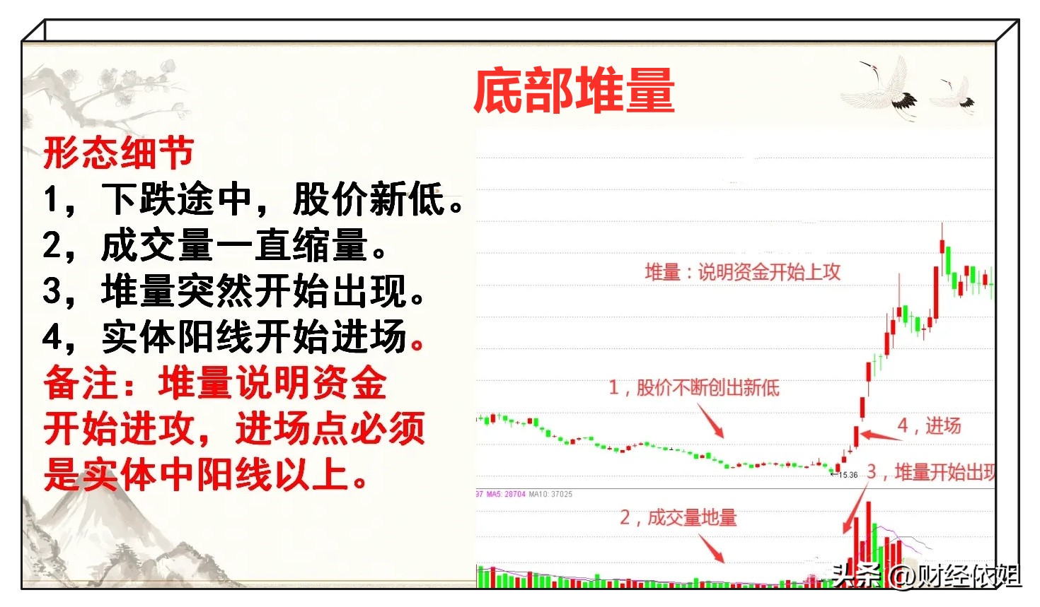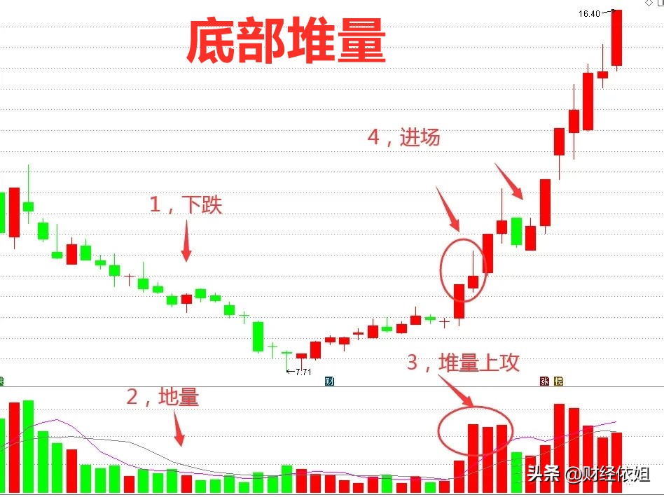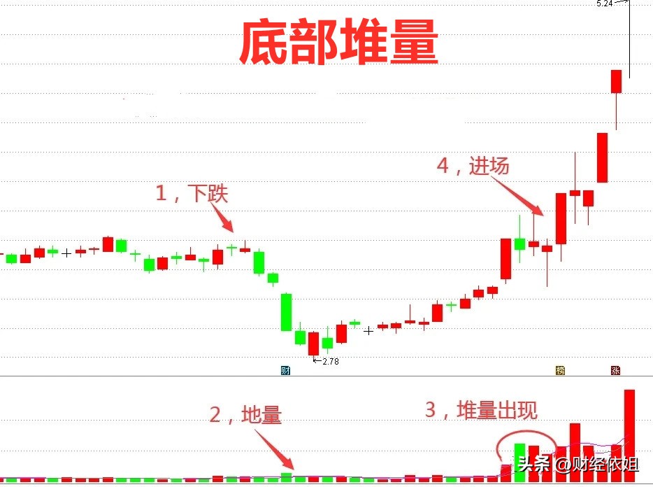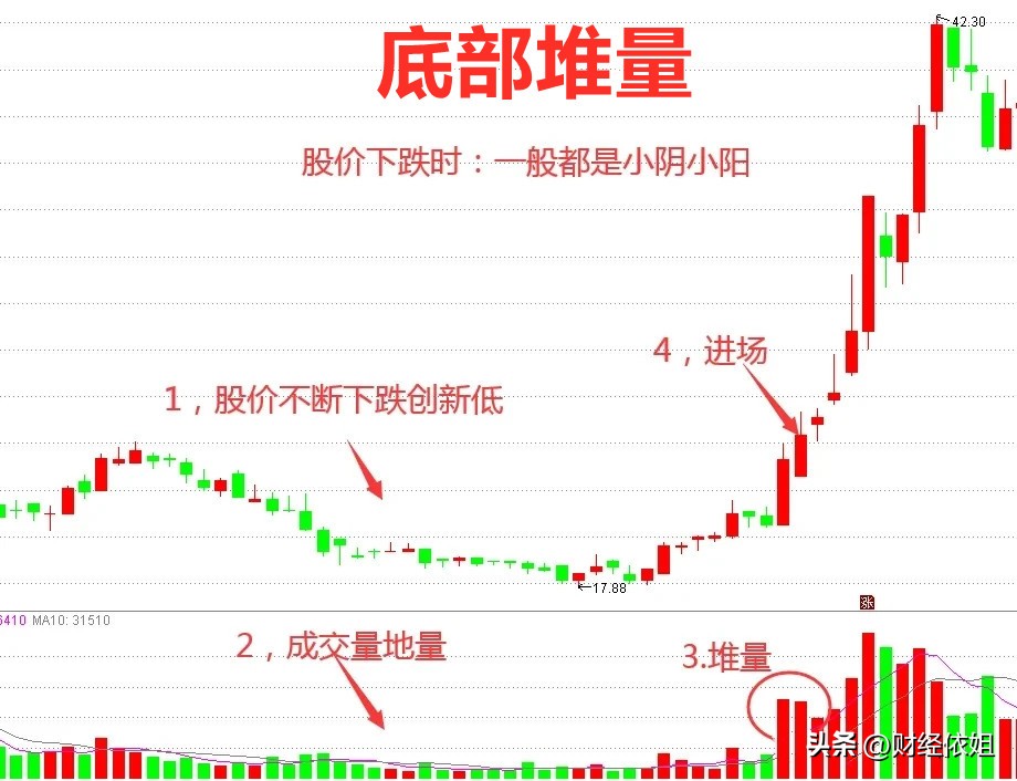 总之而言:一只股票在底部出现堆量,往往是主力已经拿到了足够的筹码,拉升意愿强烈的表现,而下跌出现极度缩量的行为,通常是洗盘很彻底的表现,所以我们在运作中,一定要注意其中的细节,为了方便大家的理解,依姐也整理了一些图文并茂股票案例,大家结合图片更更清晰的理解。
