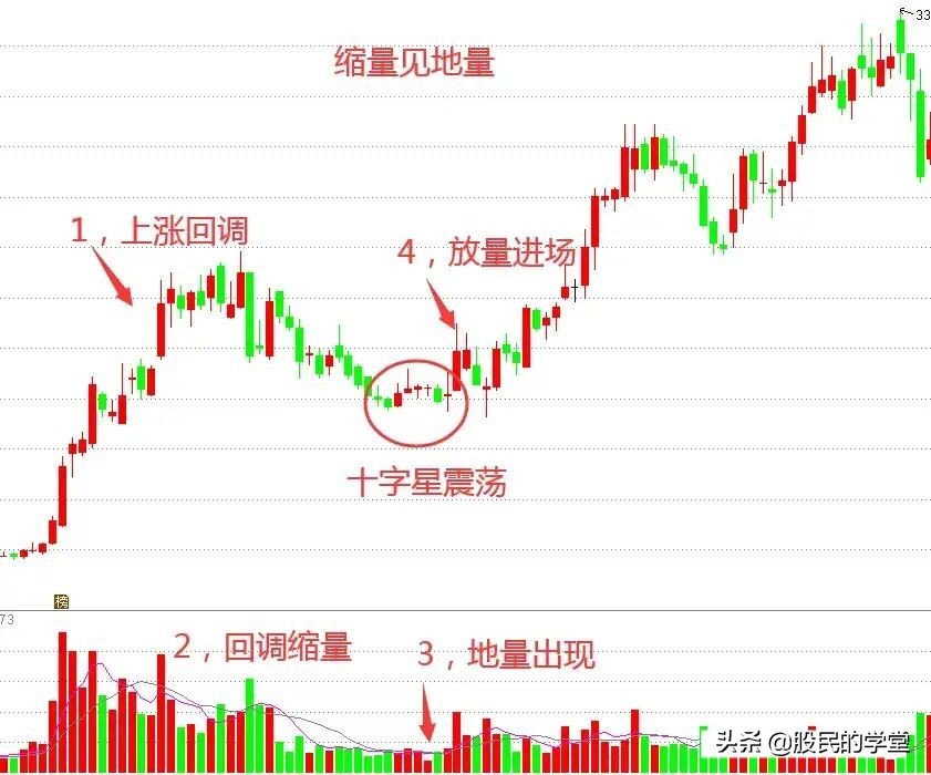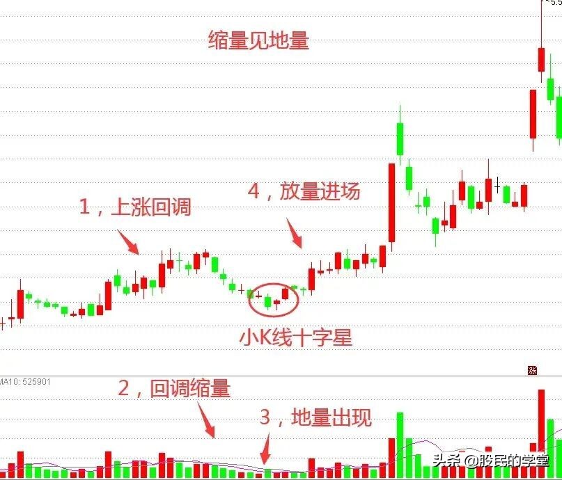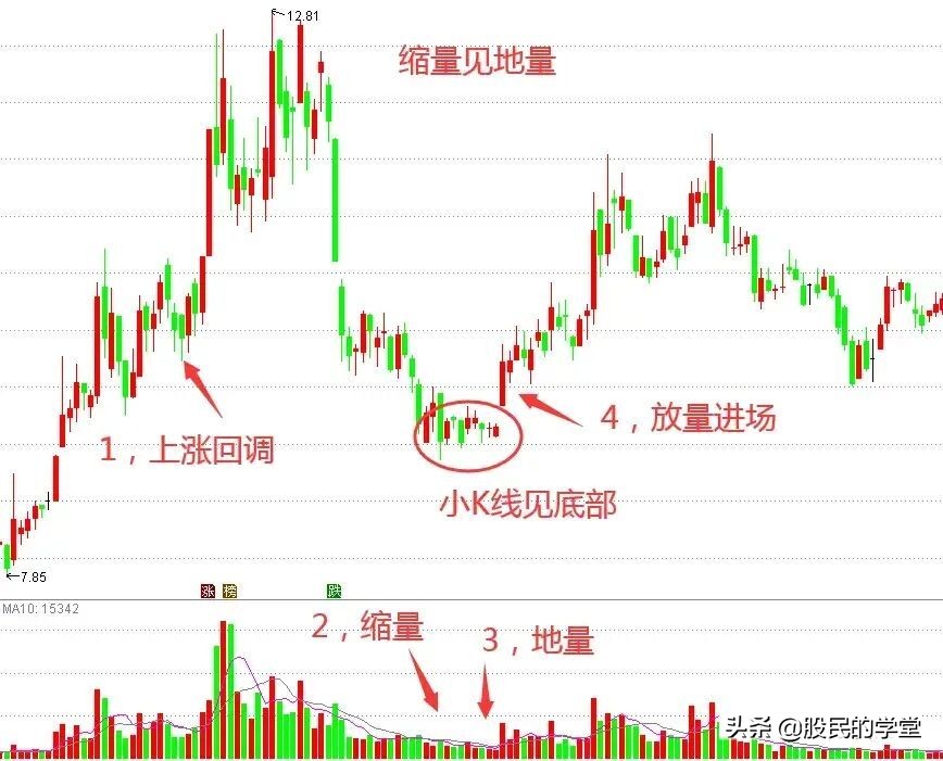 股价前方经过一段小幅拉升,随后展开逐步缩量调整,当回调至关键支撑位置出现止跌形态时,成交量出现地量水平,随后股价走出上攻行情。