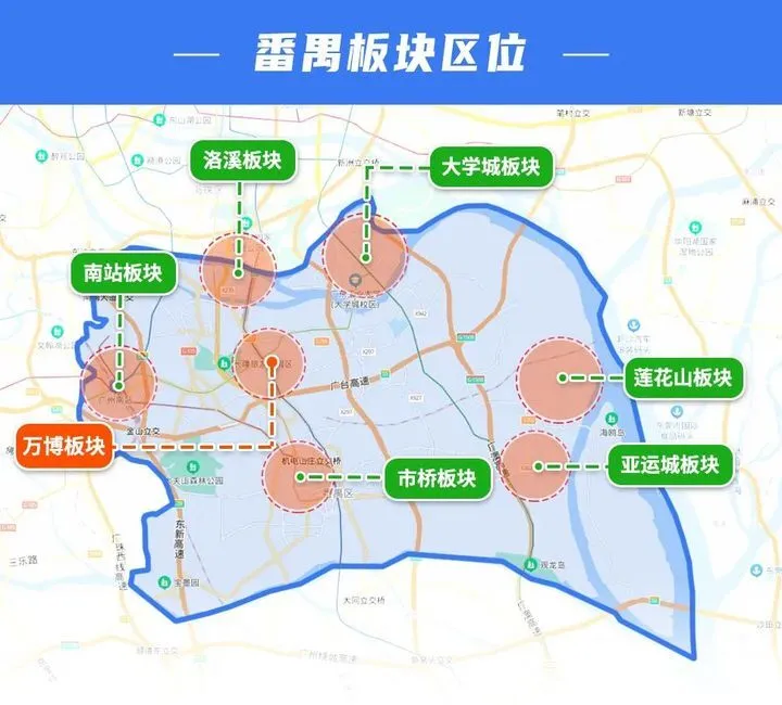 万博板块在番禺的西北部,与紧邻的主城区海珠隔江相望,是广州南拓的前沿阵地。