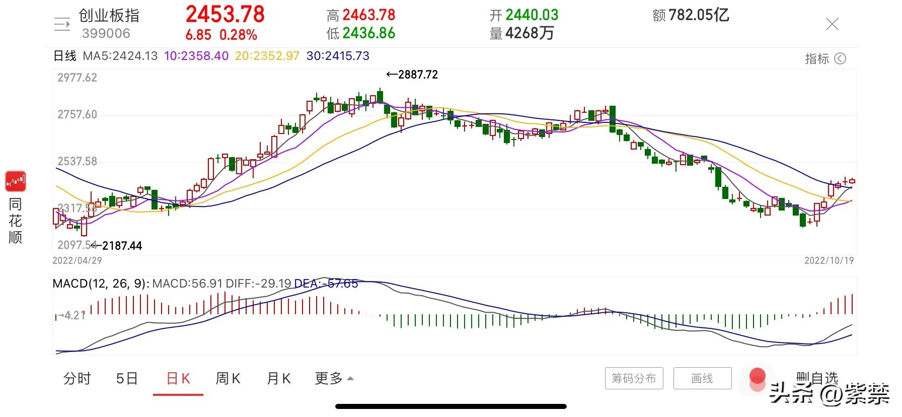 我们重点看一下创业板指数的技术指标,首先创业板指数在2200点附近获得了支撑,2200点,可以说是整个创业板指数非常非常重要的支撑线。