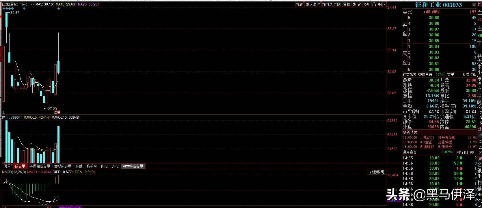 征和工业 (003033)次新农机龙头,周五冲高回落,周一要是不低开预计没跌破5日均线还会上冲。