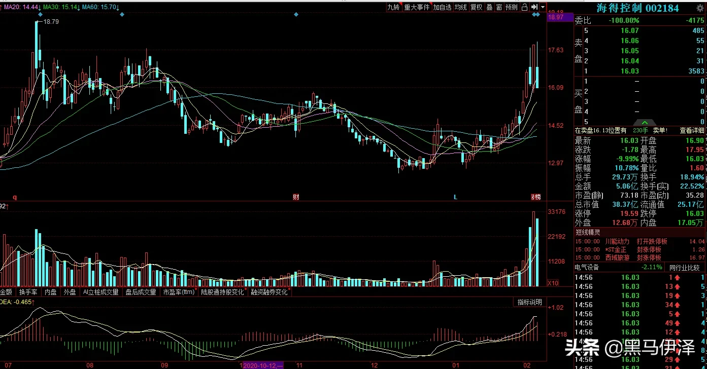海得控制002184 周四涨停,周五跌停,周一要是能守住15.60一线的支撑,那么说明上涨的震荡是对去年7月份成交密集区的洗盘,要是能在15.60到18元区间形成强势放量横盘区,后期就可能创新高,但是跌破就要小心回调。
