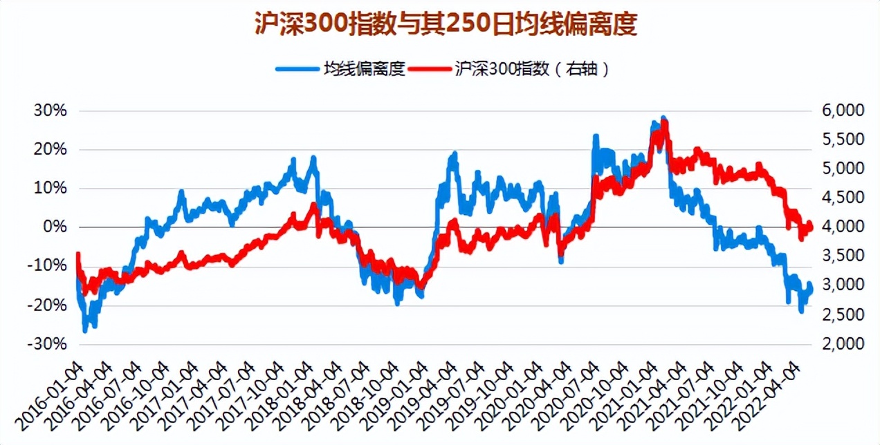 2、一般看中长期均线偏离度,如250日均线,它也是一条牛熊分界线。目前沪深300指数向下偏离其250日均线的幅度为16%,与前两周相同,都接近2016年和2018年的大跌底部,给出了较为明显的底部信号。