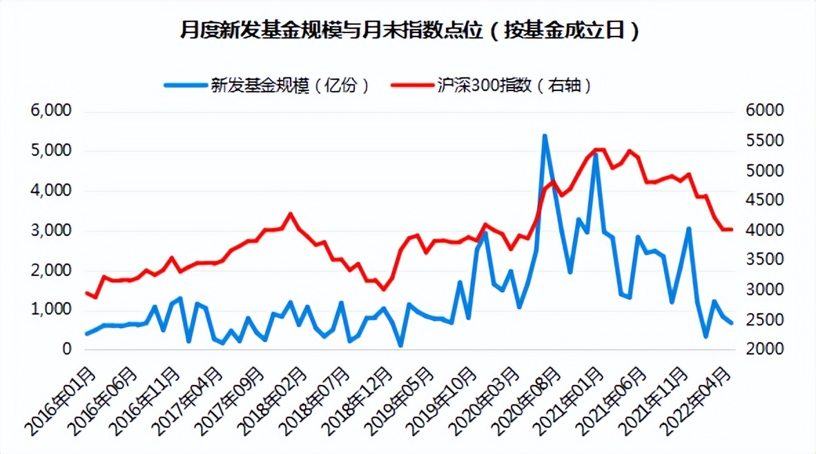 2、2021年2月以来,新基发行规模急剧缩水,截至2022年5月27日,本月仅成立55只基金,共计发行673.46亿份,接近2016年以来的最低水平,可见基金市场投资者的情绪已经极为低迷,距离底部反转越来越近。