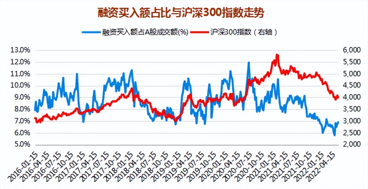 1、融资买入额占比=融资买入额/A股总成交额,反映了场内投资者借钱炒股的热情和市场的杠杆水平。