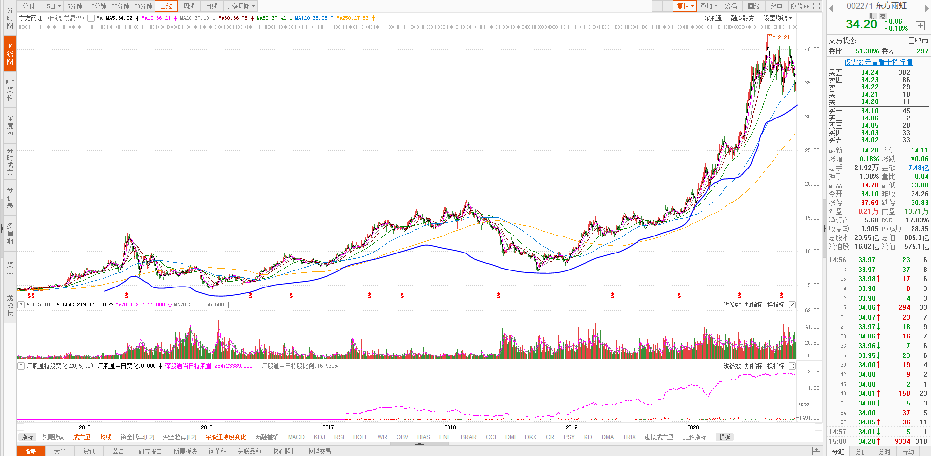 八、东方Y虹,防水建筑材料巨头,从图形看,完全没有周期股的现象,一路往东北,近几个月处于相对高位平整。前三季度roe17.83%,2015年6月12的收盘价11.44元,今日收盘价34.2元,五年多的时间涨幅198%,三季度基金家数为170家,较二季度629家大幅减少,占流比份额也三分之一。见图9。