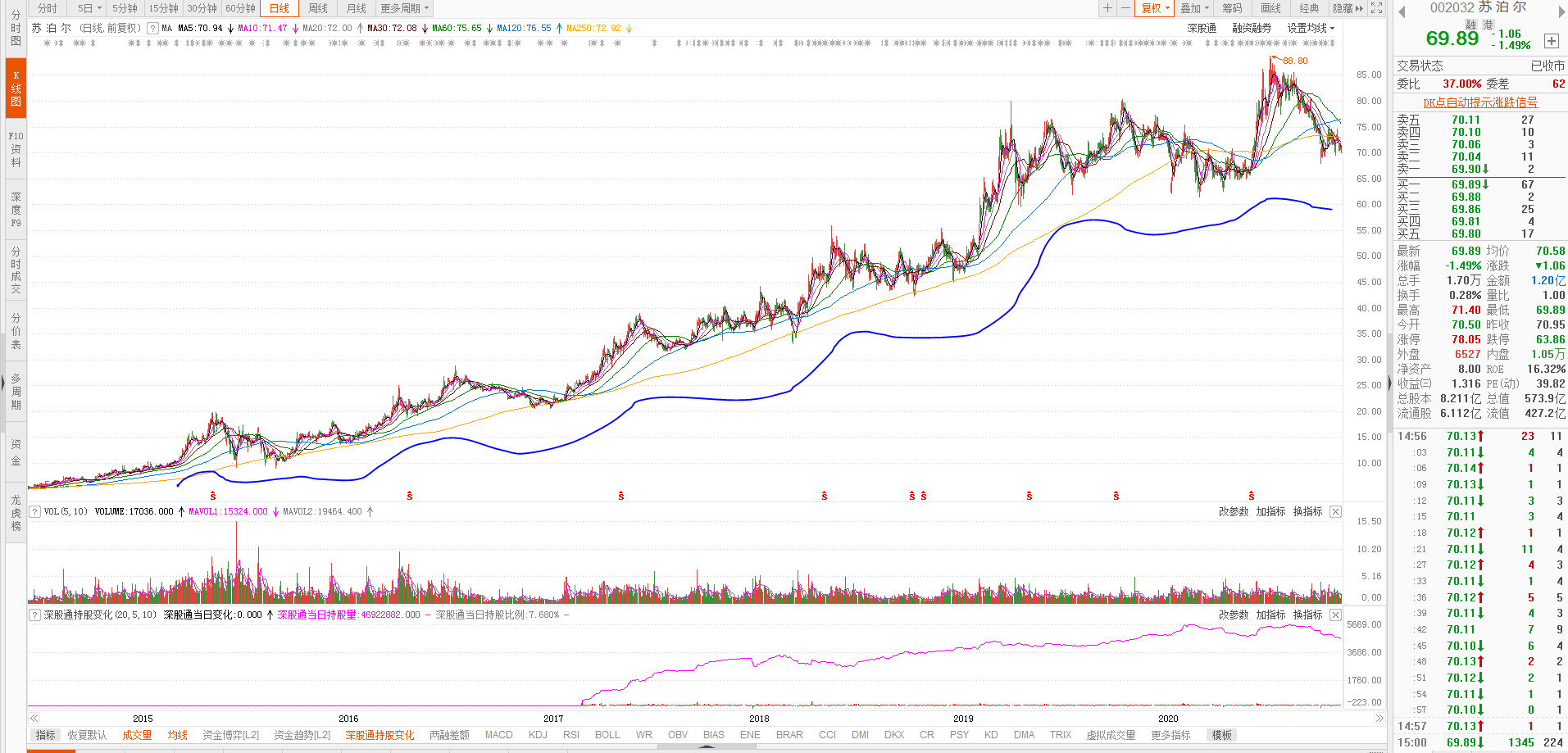 四、苏B尔,厨电龙头,近两年走势震荡状态,今年七月份创新高,接着继续晃荡。前三季度roe16.32%,2015年6月12的收盘价21.94元,今日收盘价69.89元,五年多的时间涨幅285%,三季度基金家数为27家,较二季度275家断涯下降,但占流比份额只是稍减。见图5。