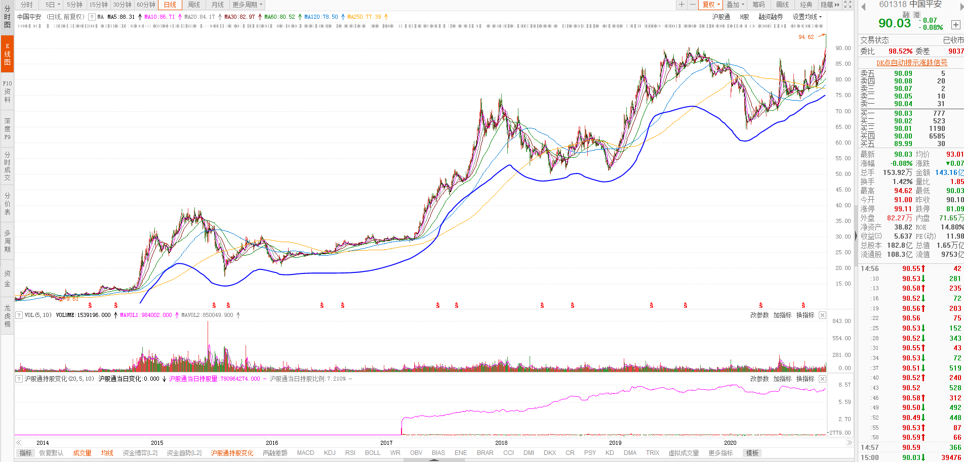 十一、平安,保险、金融巨头,今天创出历史新高回落。前三季度roe14.8%,2015年6月12的收盘价37.29元,今日收盘价90.03元,五年多的时间涨幅142%,三季度基金家数为1003家,较二季度1202家小幅减少,占流比份额却略增。见图12。