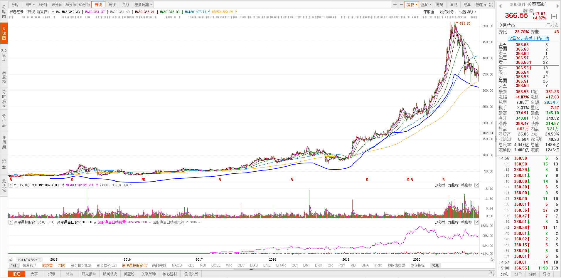 二、长春G新,生长激素巨头,今年八月初创出历史新高后下调至今,下调幅度近三分之一。近两年ROE达20%以上,前三季度roe高达24.53%,2015年6月12的收盘价70.71元,今日收盘价366.55元,五年多的时间涨幅406%,三季度基金家数为341家,较二季度1133家大幅减少,但占流比份额减幅五分之二。见图3。