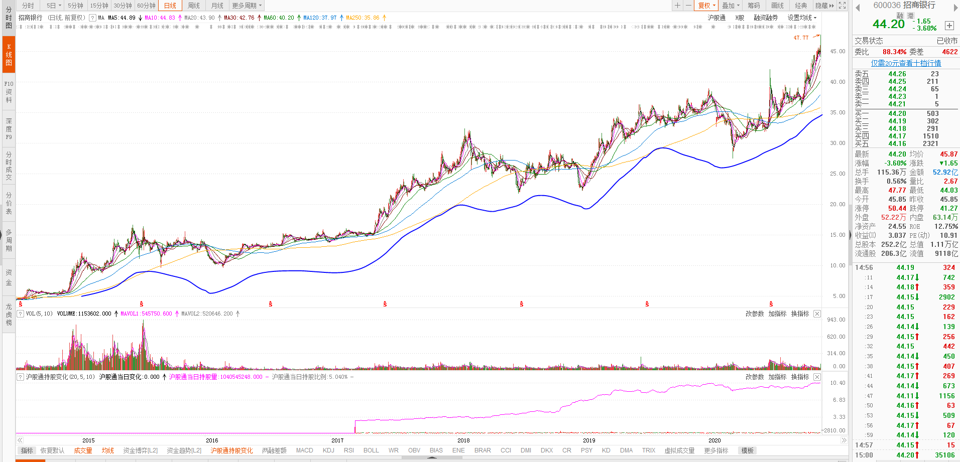 九、招商Y行,零售业务银行第一,图形一直往东北方向前进,今天创历史新高。前三季度roe8.36%,2015年6月12的收盘价15.23元,今日收盘价44.2元,五年多的时间涨幅190%,三季度基金家数为745家,较二季度1083家小幅减少,占流比份额只是稍减。见图10。