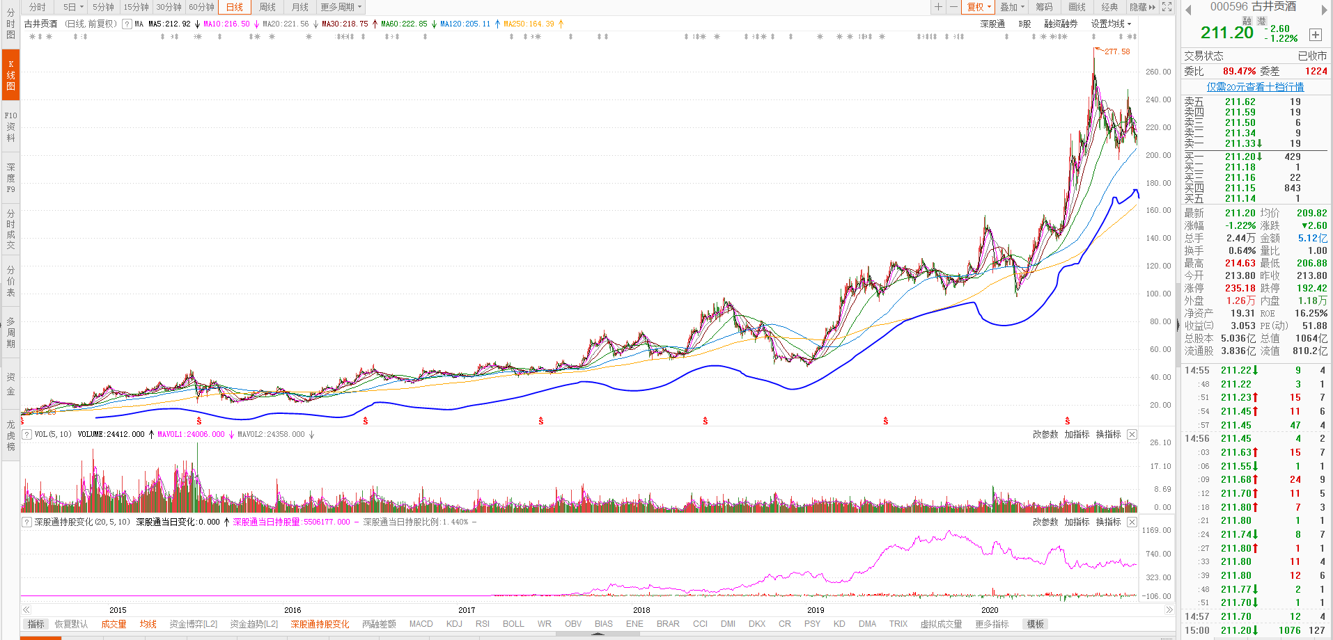 一、古井贡J,二梯队白酒,前年去年营收与净利增收迅猛,截止今年三季度较去年逊色一些,今年9月份股价创出历史新高,近几个月平整状态,近期白酒板块创新高没它什么事。前三季度roe16.25%,2015年6月12的收盘价38.41元,今日收盘价211.2元,五年多的时间涨幅423%,三季度基金家数为83家,较二季度383家大幅减少,占流比份额也减幅三分之一。见图2