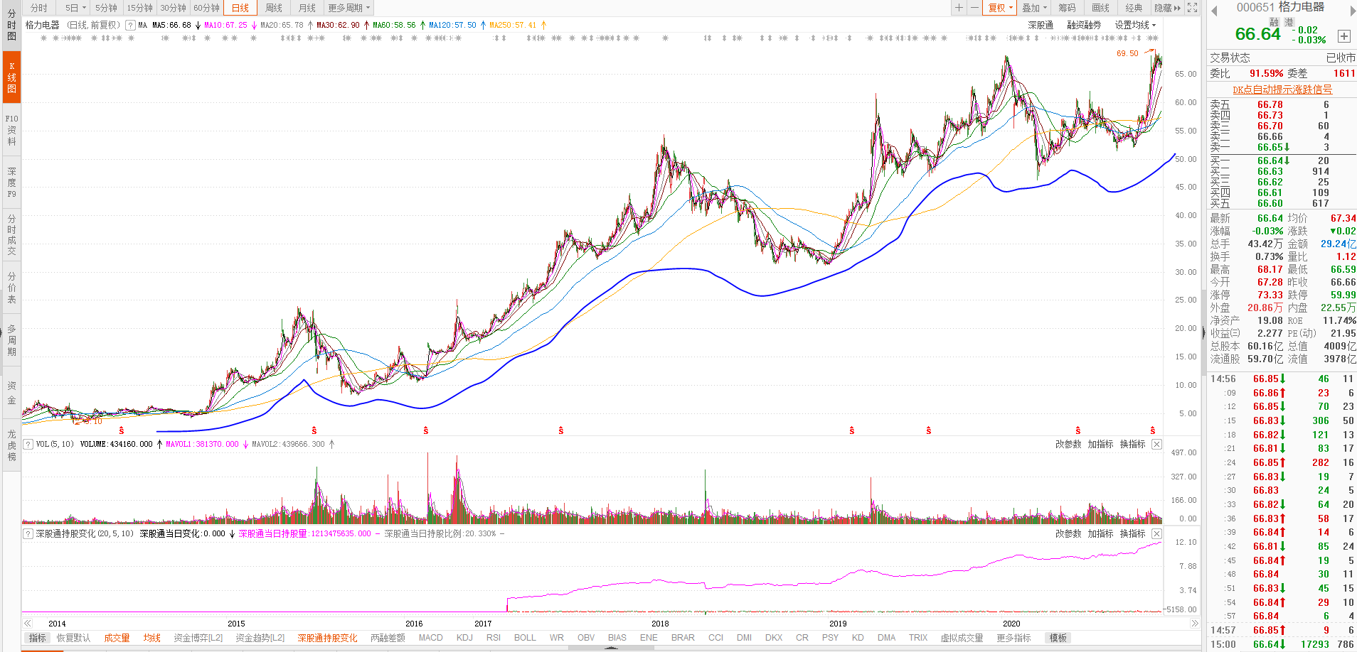 六、格力D器,空调巨头,去年格力集团混改,卖了15%份额给高瓴资本,高瓴资本一举成为大股东,近几日刚创出新高,外资持续流入。前三季度roe高达11.74%,2015年6月12的收盘价21.76元,今日收盘价66.64元,五年多的时间涨幅210%,三季度基金家数为418家,较二季度1202家大幅减少,占流比份额也减半。见图7。