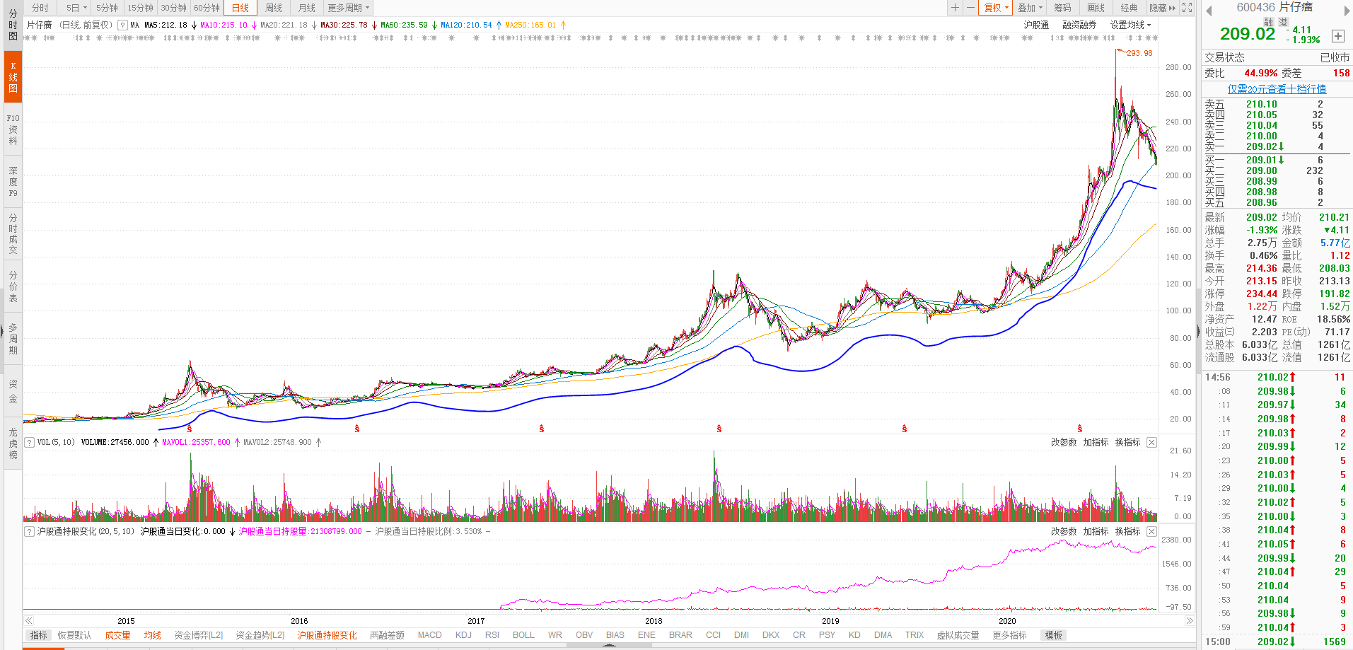 三、片Z癀,中药一哥,今年九月初创出历史新高后下调至今,下调幅度近三分之一。林园私募三季度大幅度减仓,前三季度roe18.56%,2015年6月12的收盘价50.89元,今日收盘价209.02元,五年多的时间涨幅308%,三季度基金家数为54家,较二季度425家大幅减少,但占流比份额减幅三分之二。见图4。