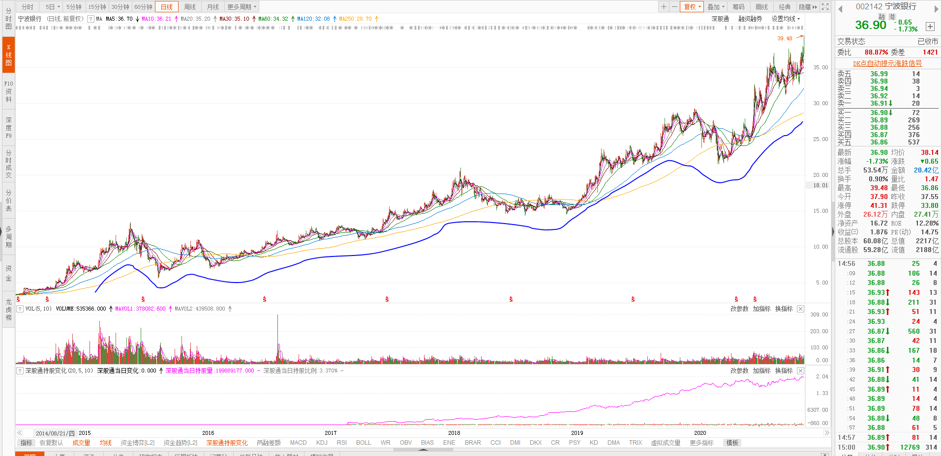 七、宁波Y行,图形一直稳稳当当往东北方向,今天还创出历史新高。前三季度roe12.28%,2015年6月12的收盘价12.15元,今日收盘价36.9元,五年多的时间涨幅208%,三季度基金家数为418家,较二季度1202家大幅减少,占流比份额也减半。见图8。