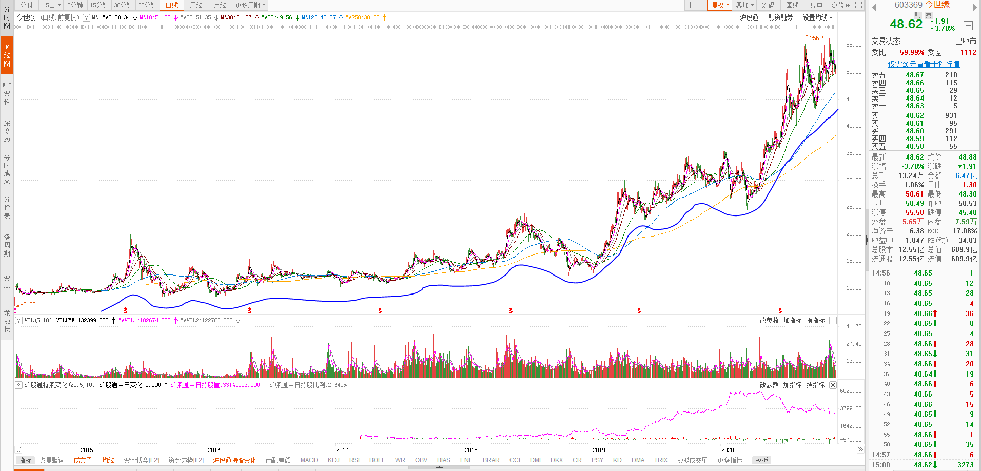十、今S缘,二梯队白酒,近几年营收与净利增长进入快车道,今年八月底创出历史新高,目前相对高位震荡。前三季度roe17.08%,2015年6月12的收盘价18.11元,今日收盘价48.62元,五年多的时间涨幅178%,三季度基金家数为71家,较二季度412家大幅减少,占流比份额也接近减半。见图11。