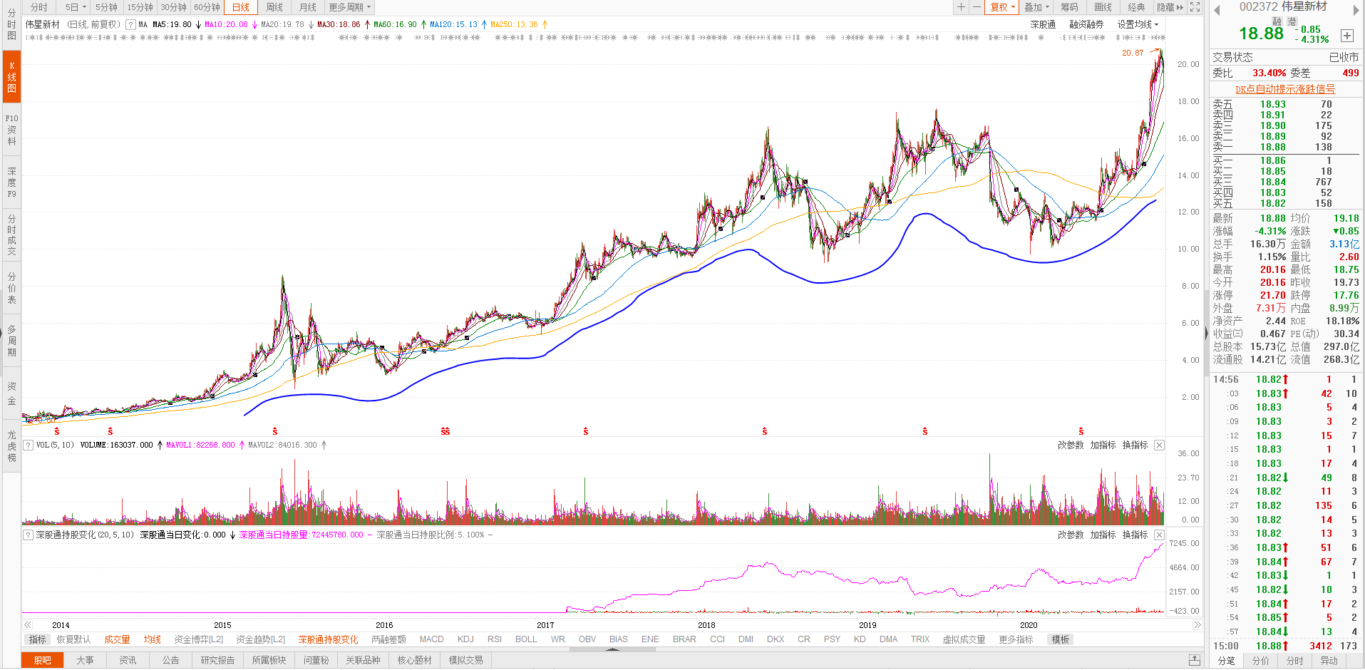 十二,伟星X材,塑料管道龙头,从图形上,去年初至今走出两个U型后创新高,且前几日刚创新高回落。前三季度roe18.18%,2015年6月12的收盘价7.98元,今日收盘价18.88元,五年多的时间涨幅128%,三季度基金家数为26家,较二季度158家大幅减少,占流比份额也减少四分之一。见图13。