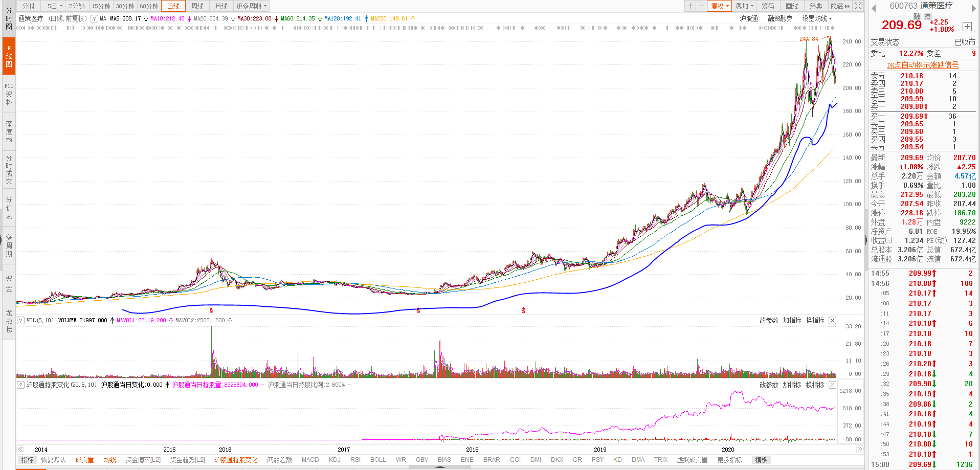 五、通策Y疗,口腔医疗巨头,本月中旬还创出新高,近几天调整状态。前三季度roe19.95%,2015年5月22的收盘价55.05元(2015年停牌半年,2015年年底复牌),今日收盘价209.69元,五年多的时间涨幅285%,三季度基金家数为129家,较二季度389家大幅度下降,占流比份额也减幅三分之一。见图6。