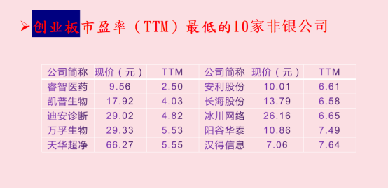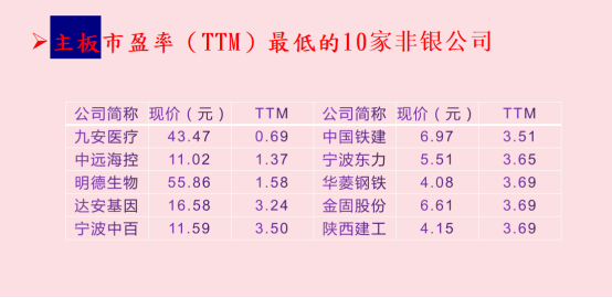 截至9月30日,以TTM为例,剔除亏损、ST股、银行股后主板、创业板、科创板三大板块市盈率(TTM)最低的10家公司是谁?老陈已经整理列表,供大家参考: