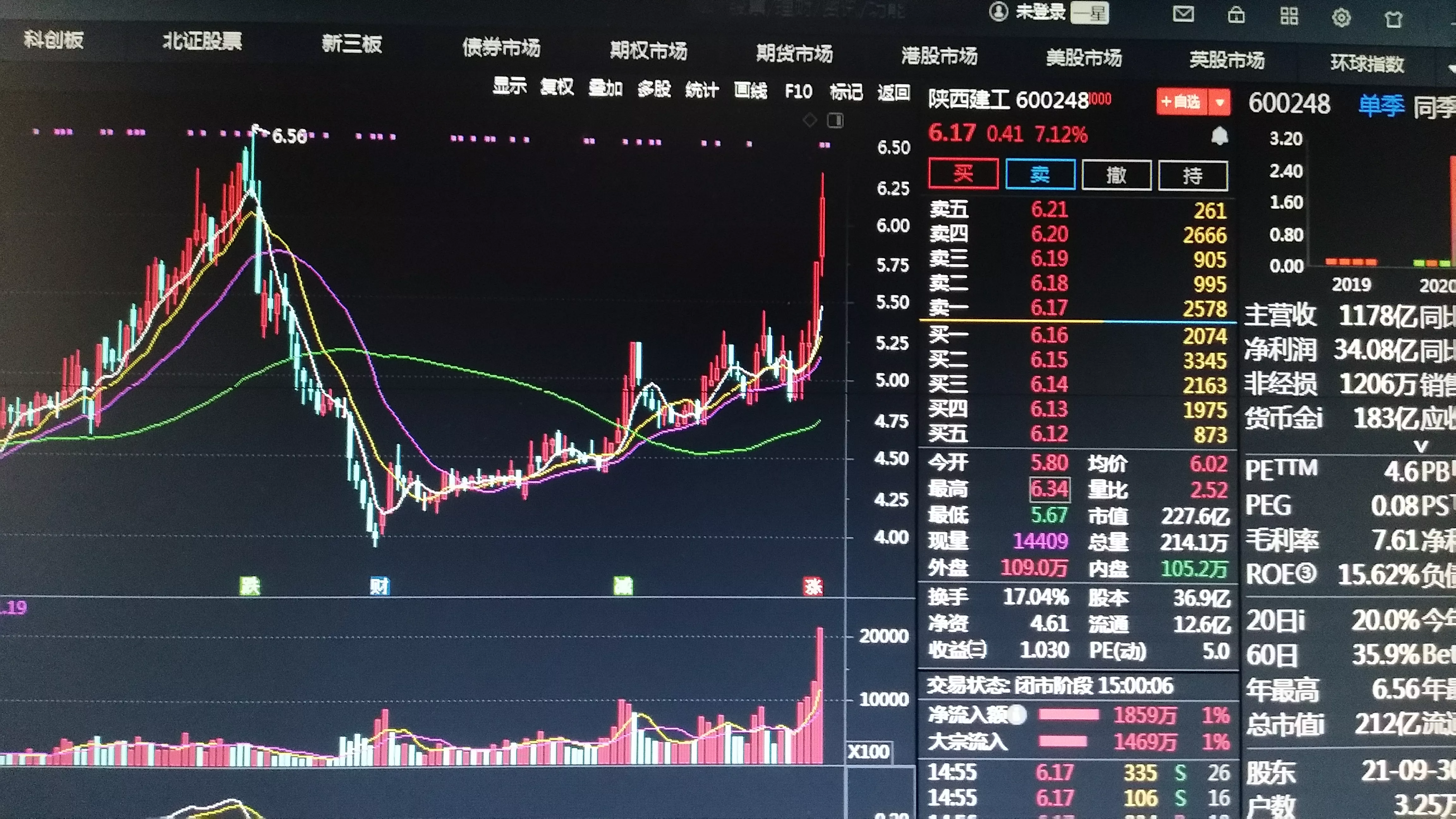 陕西建工今天的涨幅是7.12%,股票价格是6.17元,它是在前一个交易日涨停的基础上,今天持续性的高开高走,换手率达到了17.04%,前三季的每股收益达到了1.03元,这个业绩无论是在沪深两市还是在创业板、科创板中间都是一个相对的绩优股的标准,它的流通股本是12.6亿,每股净资产也达到了4.6元。