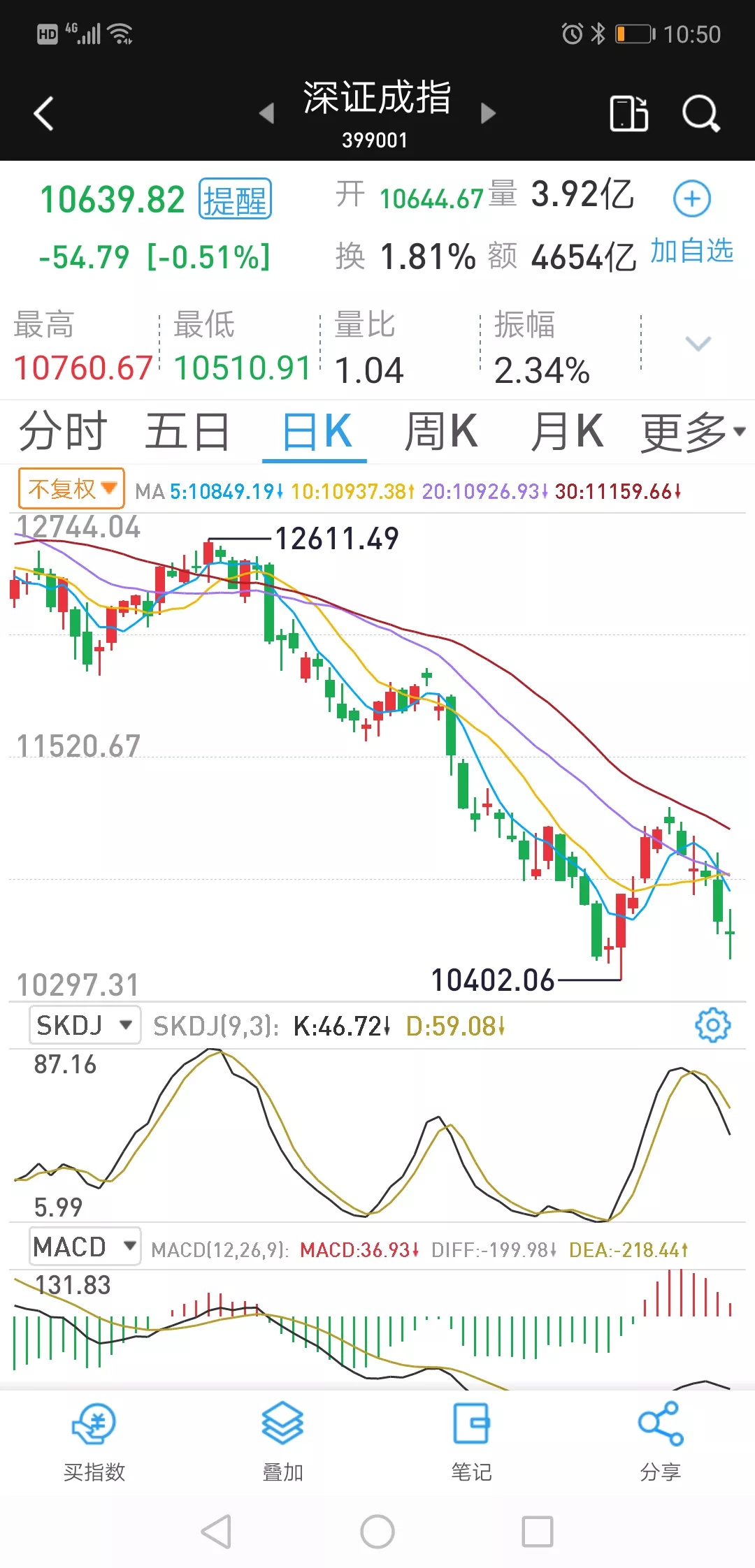 2022年10月25日为第27交易日,当日深股大盘下跌54.79点,下跌0.51%,收盘10639.82点。