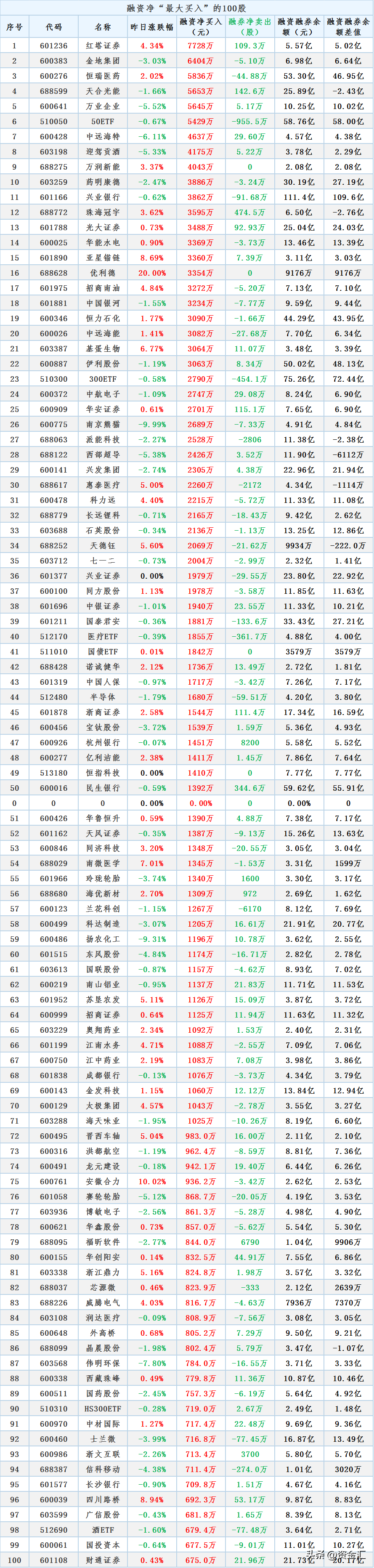个股融资融券数据,融资净“最大买入”100股,名单出炉