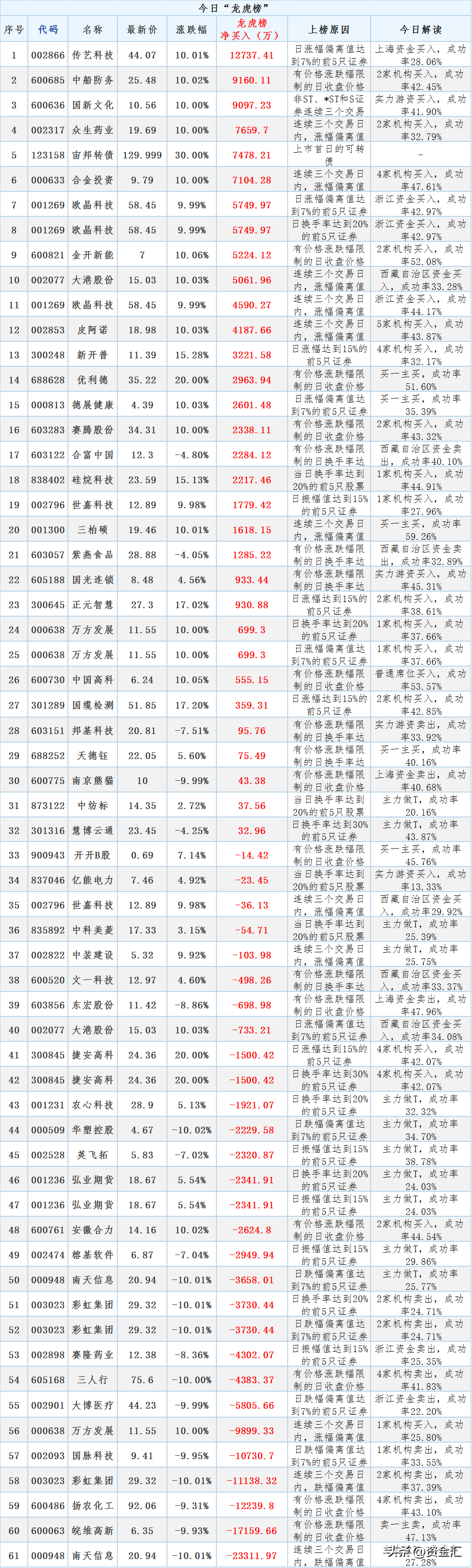今日“龙虎榜”净买入最多的个股名单!