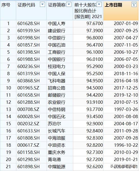 除开金融股,这些公司前十大股东持仓超过90%,大股东非常珍惜手中地股权!