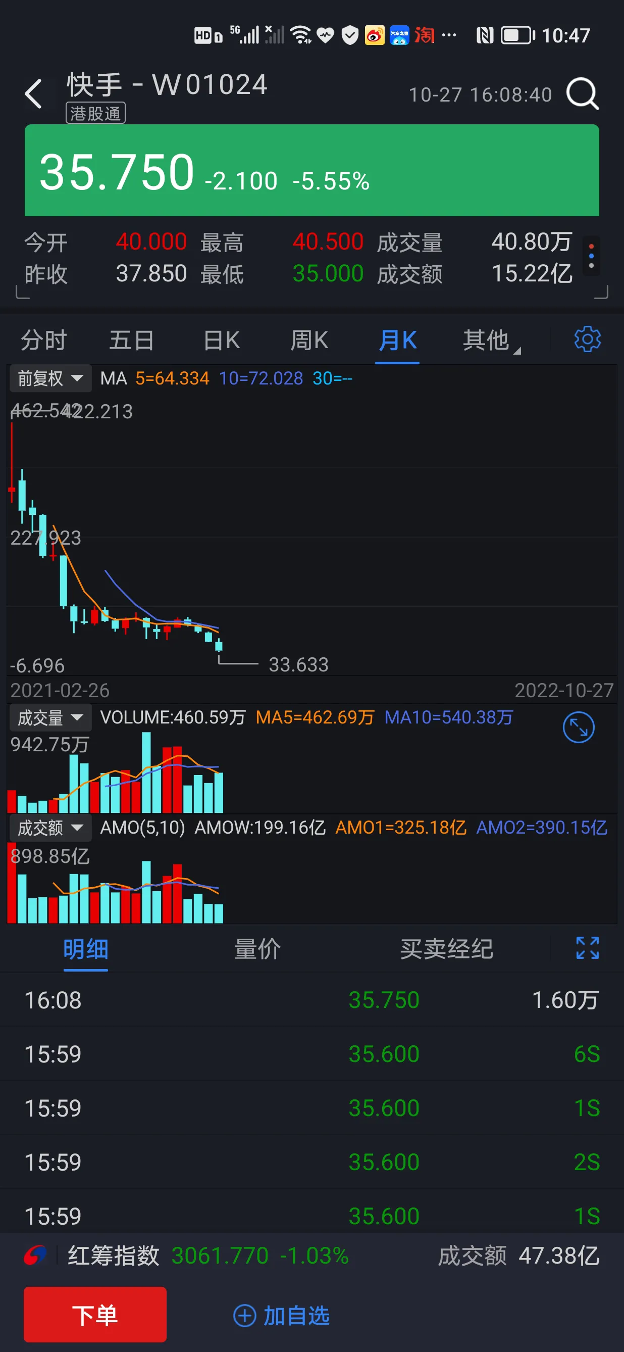 “快手”从高点儿417.8港币已经落到34港币左右。披露易披露港股通占比8.78%,共持股378035413股。按20个月均线108.78港币计算,共计占用资金约408亿港币。