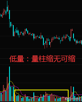 低量是指个股跌下来的时候,在底部形成长期横盘之后下方的量能缩到一点点,缩到没法再缩了,就是我们理解的百日低量群。