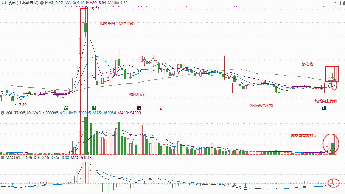 安记食品:涨停原因:食品+调味品。呈现阳极生阴,高位孕线后,空方力量占据强势,股价走势形成箱体形态,未能成功突破,随后形成矩形整理形态。近期成交量开始有效放大,均线向上发散,目前走势呈现多方炮,两阳夹一阴,冲高有信心。结合MACD指标来看,突破矩形整理形态,后市有望迎来量价齐升的上涨行情。