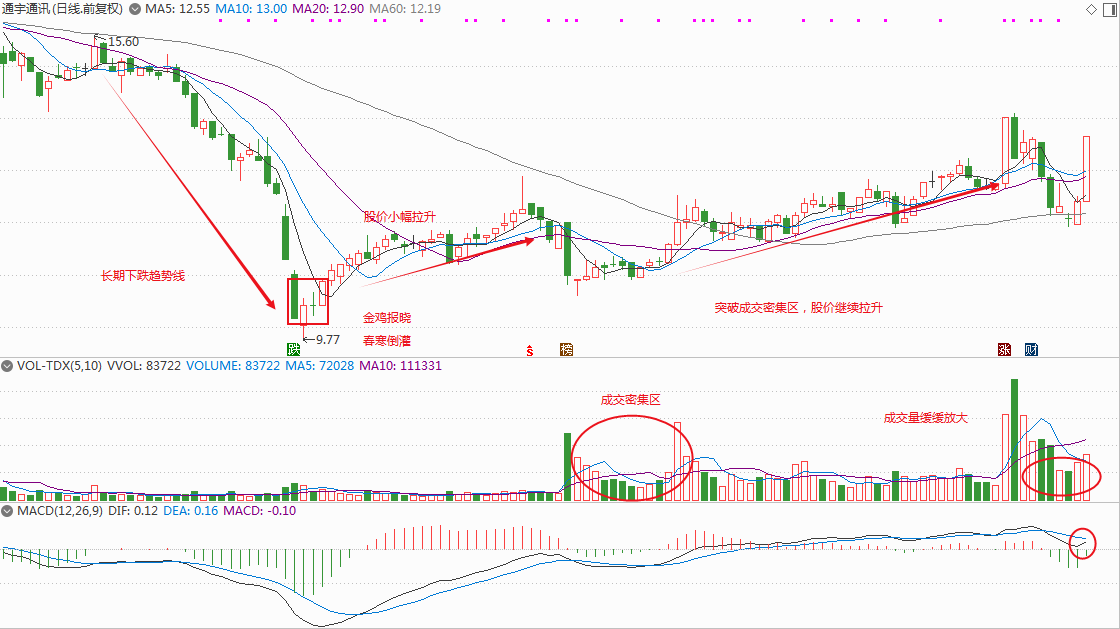 通宇通讯:涨停原因:通信设备+储能+无人驾驶。呈现金鸡报晓和春寒倒灌后,突破长期下跌趋势线,随后股价小幅拉升。成功突破成交密集区后,股价继续冲高。近期股价相对高位盘整,成交量缓缓放大。结合MACD指标来看,如果后市成交量持续有效放大,新一轮反弹行情有望持续。