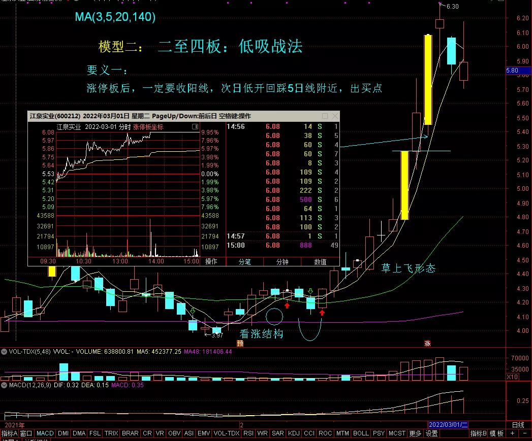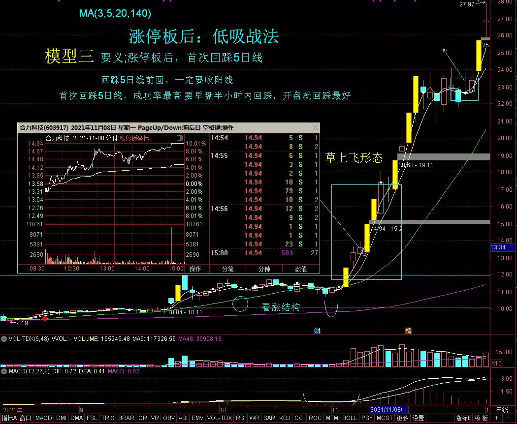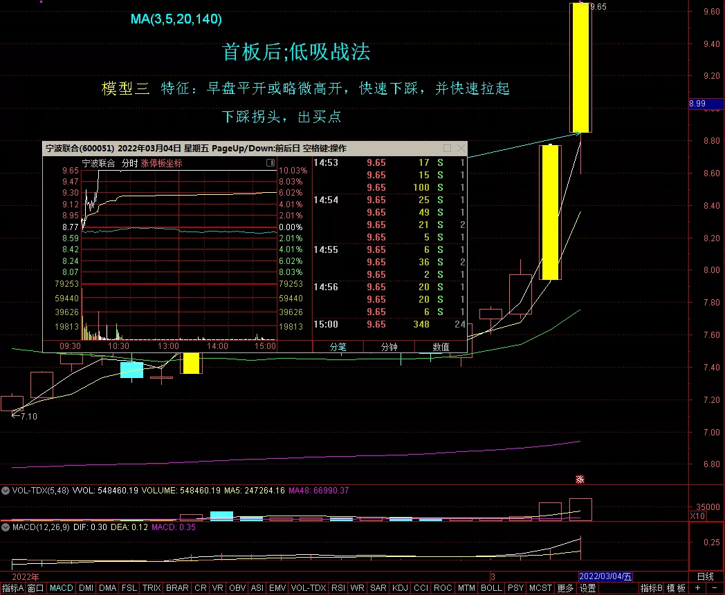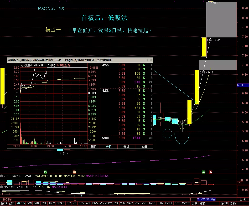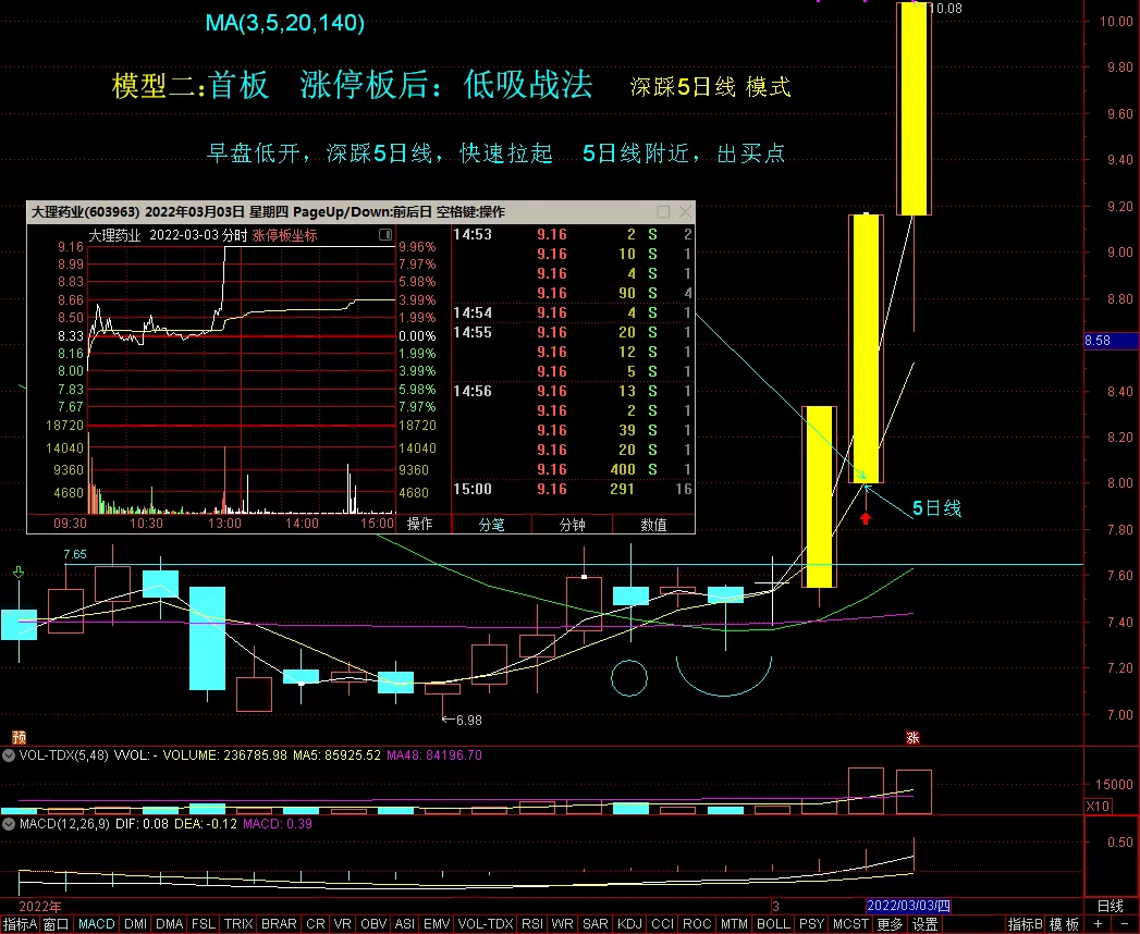 **首板后低吸战法。主要有三种类形:第一种,早盘低开,浅踩三日线,然后快速拉起。第二种,早盘低开,深踩五日线,然后快速拉起。这两种是低开洗盘模式。第三种,早盘平开或略微高开,然后下踩,用下影线洗盘,然后拉起。
