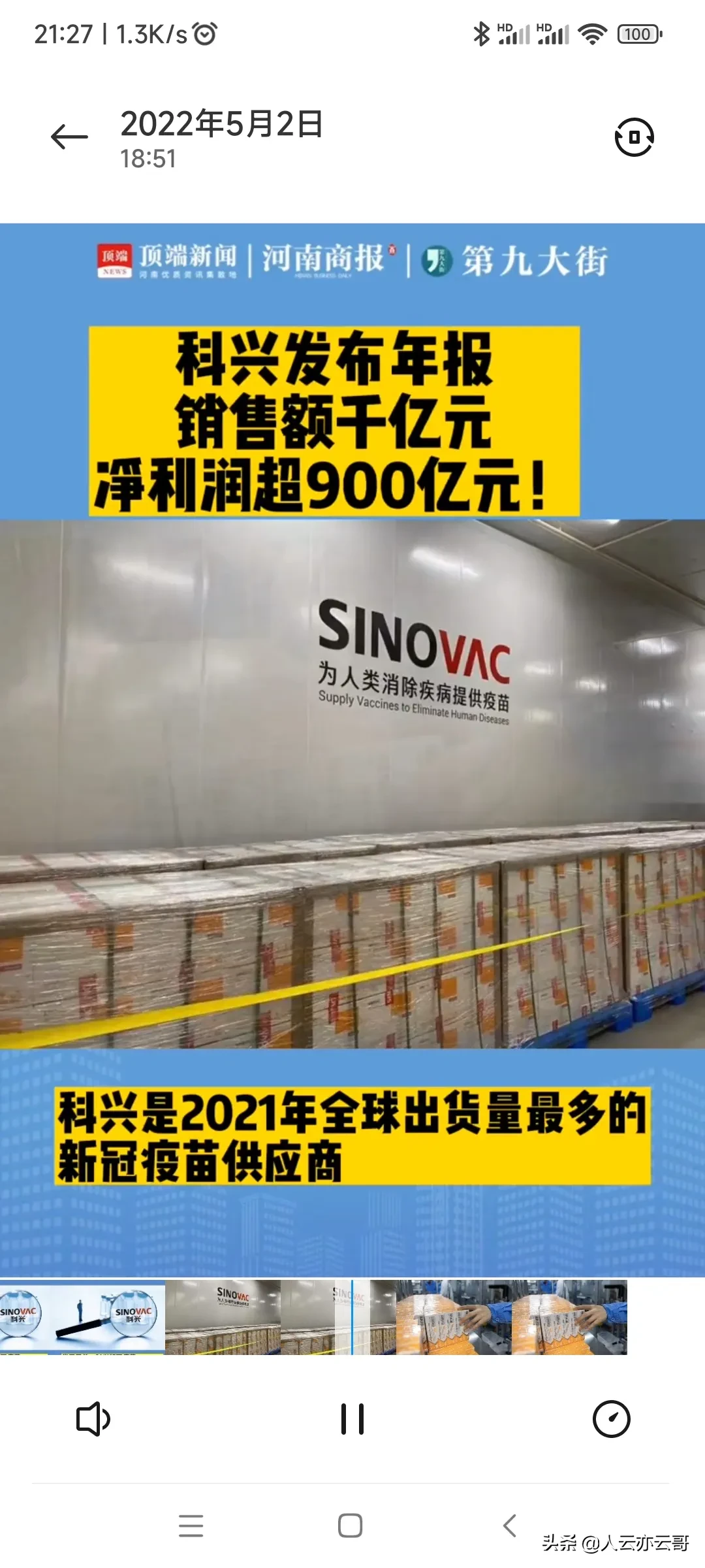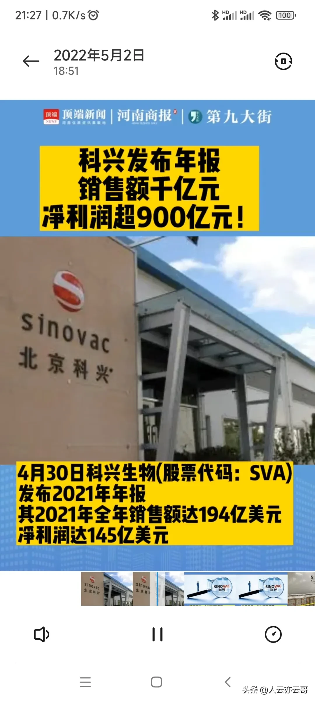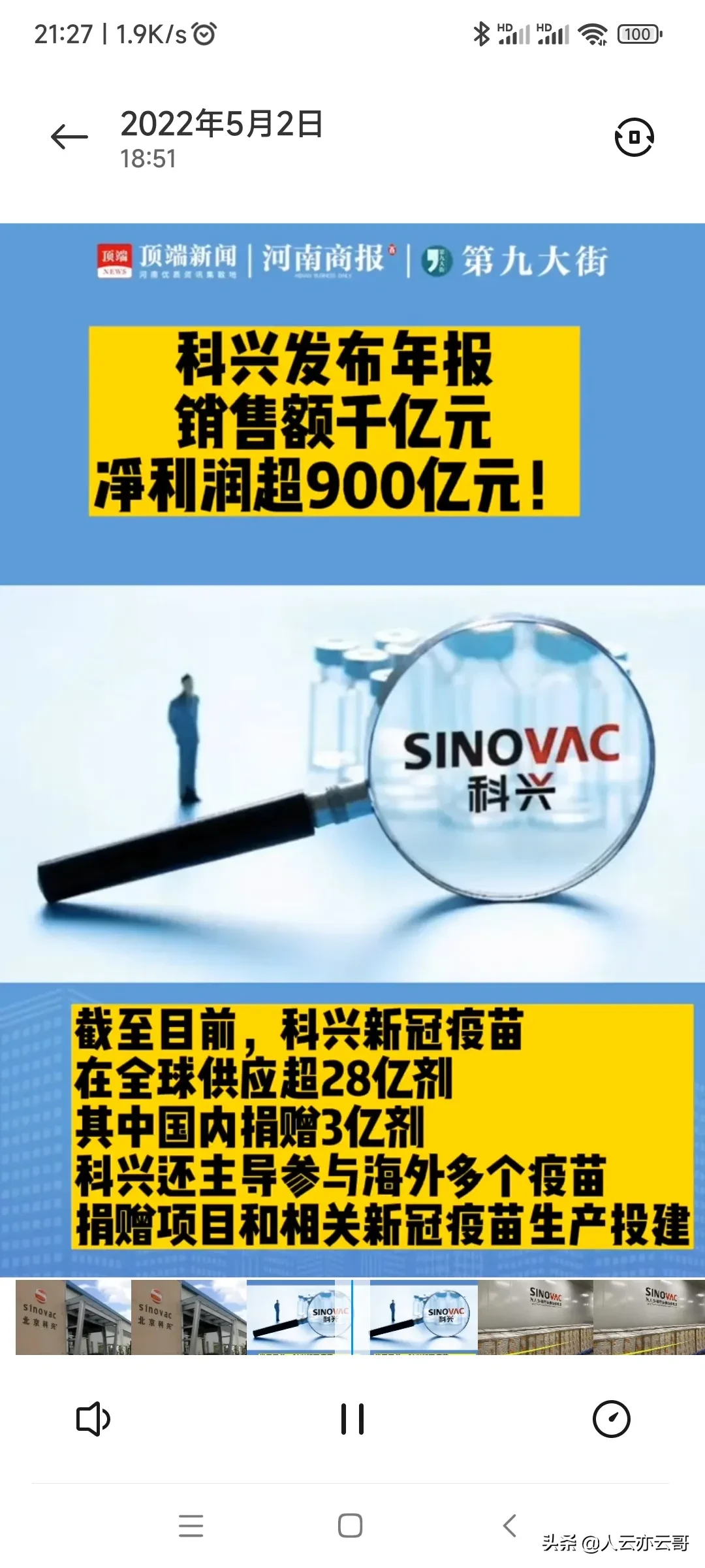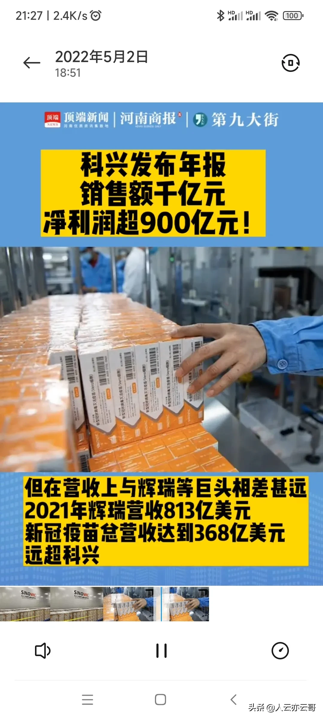 4月30日,北京科兴生物发布2021年财报:营收1280亿元,净利润956亿,增长36.9倍。全球供应新冠疫苗28亿剂,每支新冠疫苗盈利约33元。
