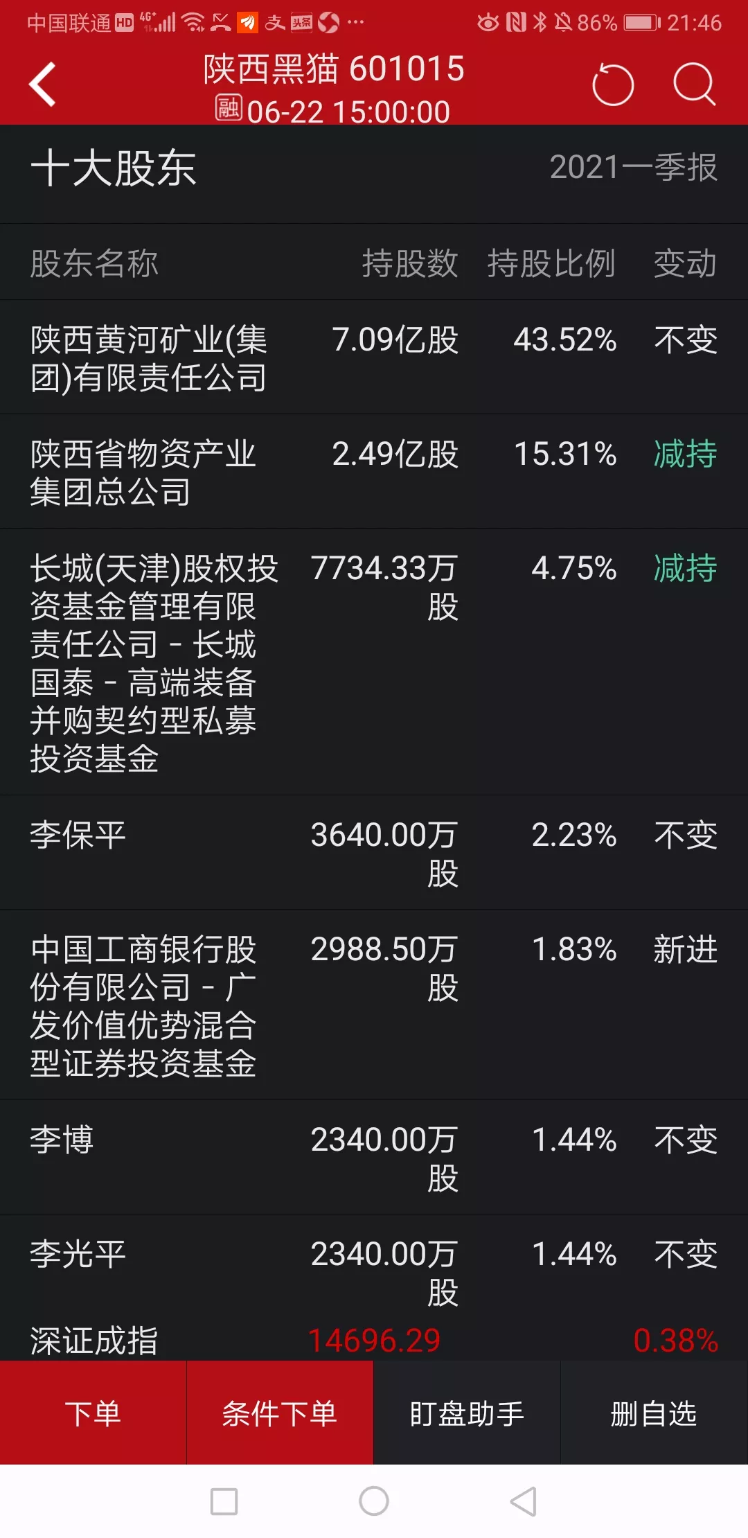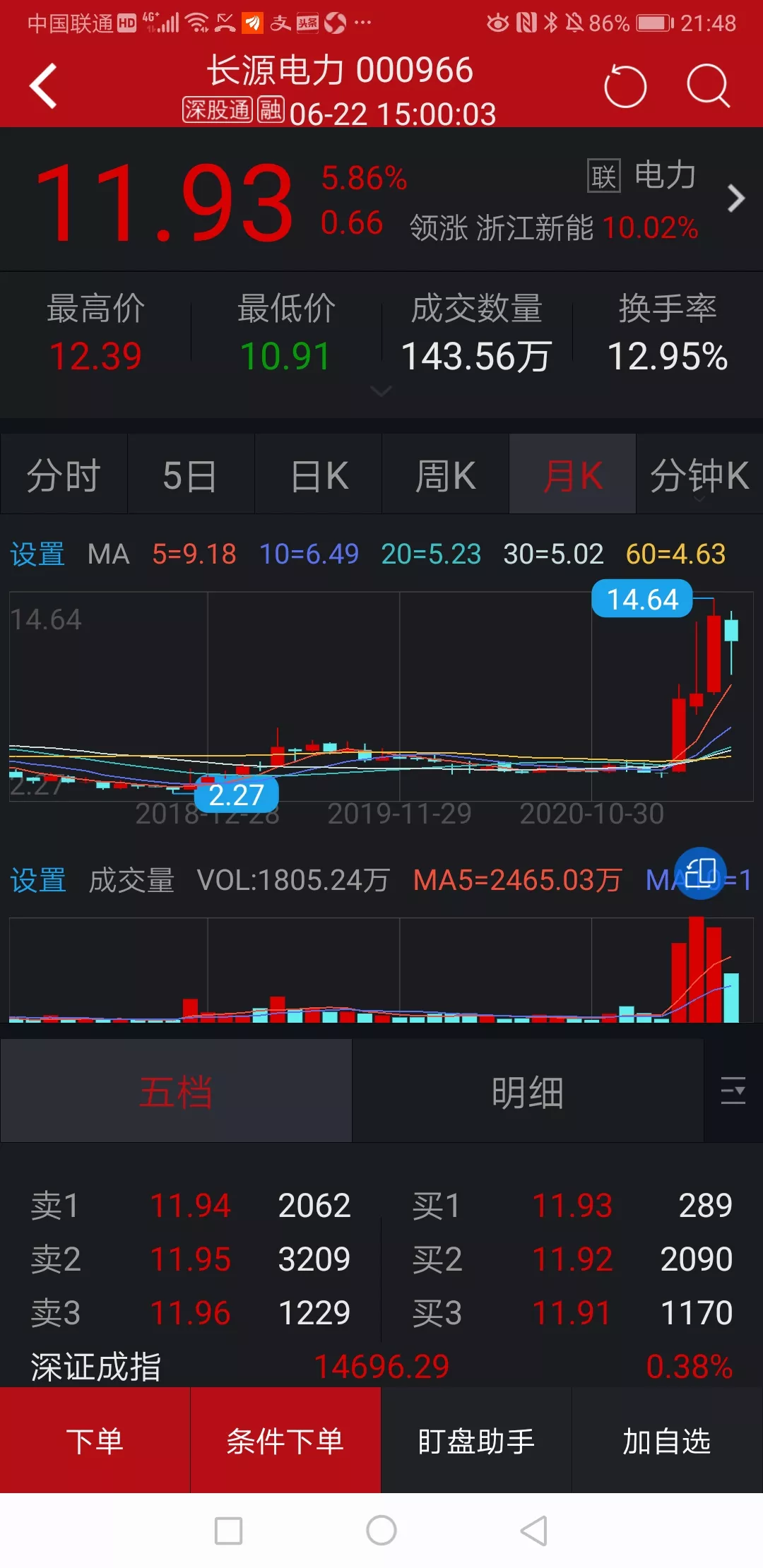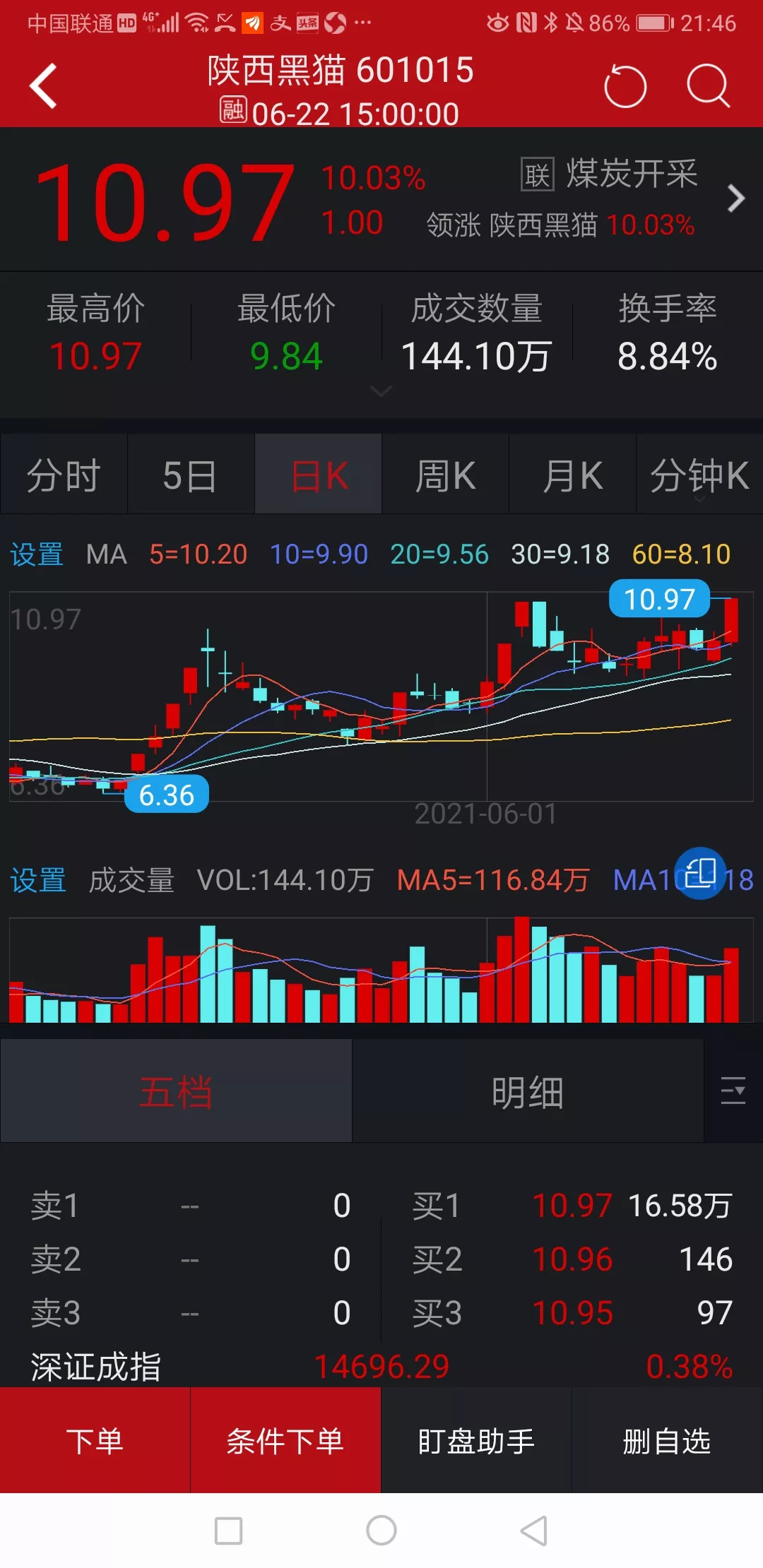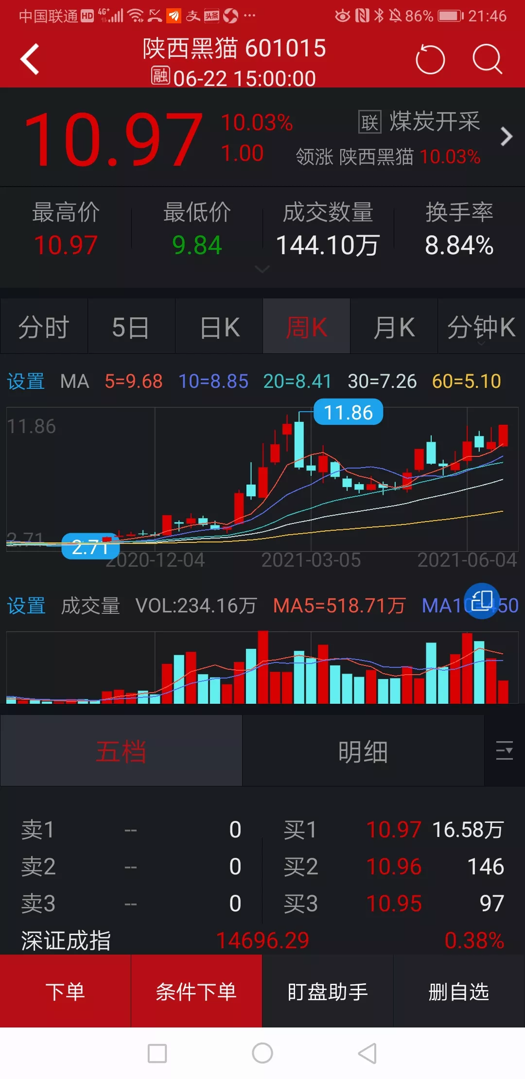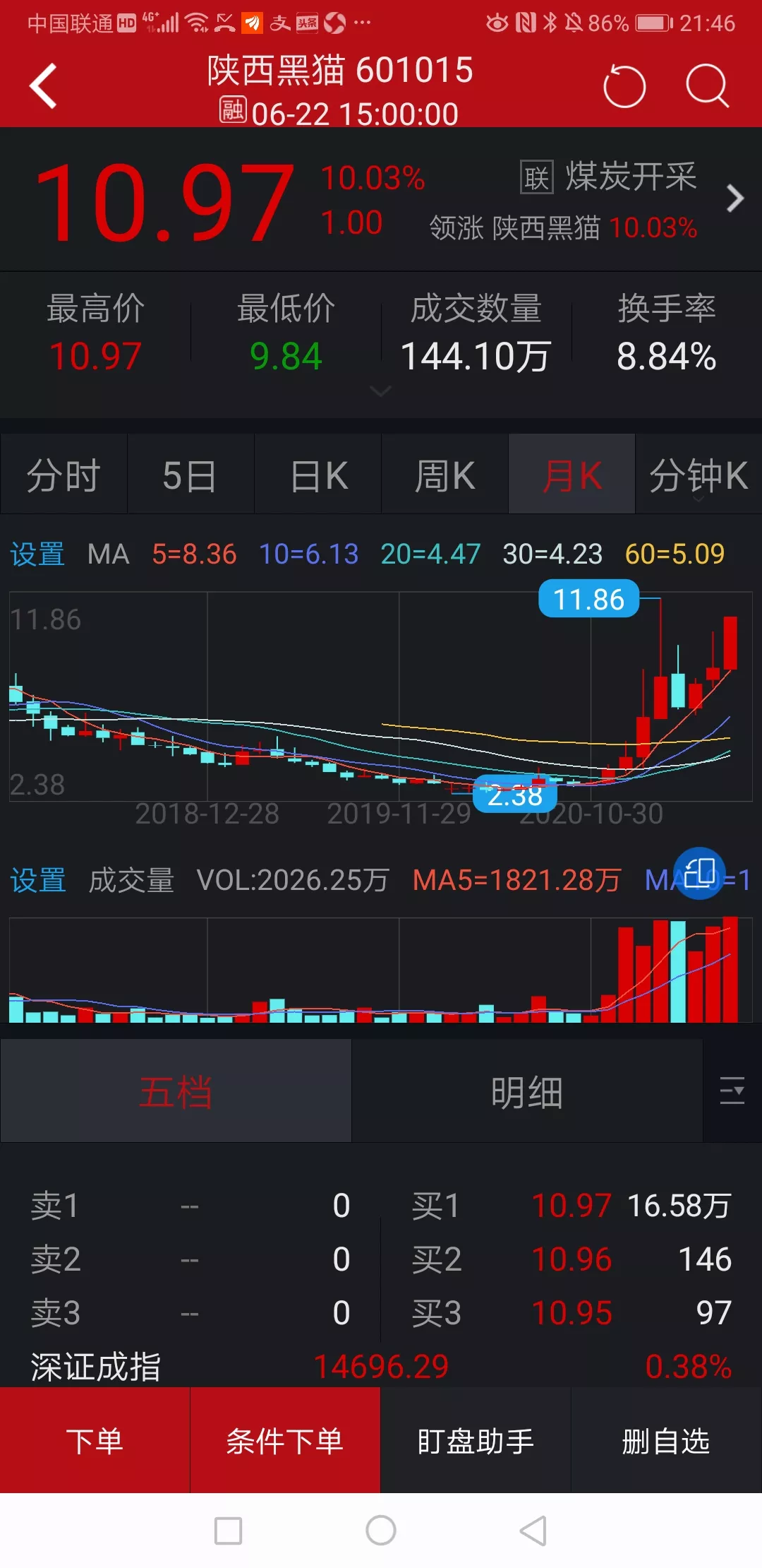 黑猫去年最低2.49元,2020收盘4.19元。最高是2月22日11.86元,今天收盘10.97元。是典型的煤炭股中第一龙头(妖股)。