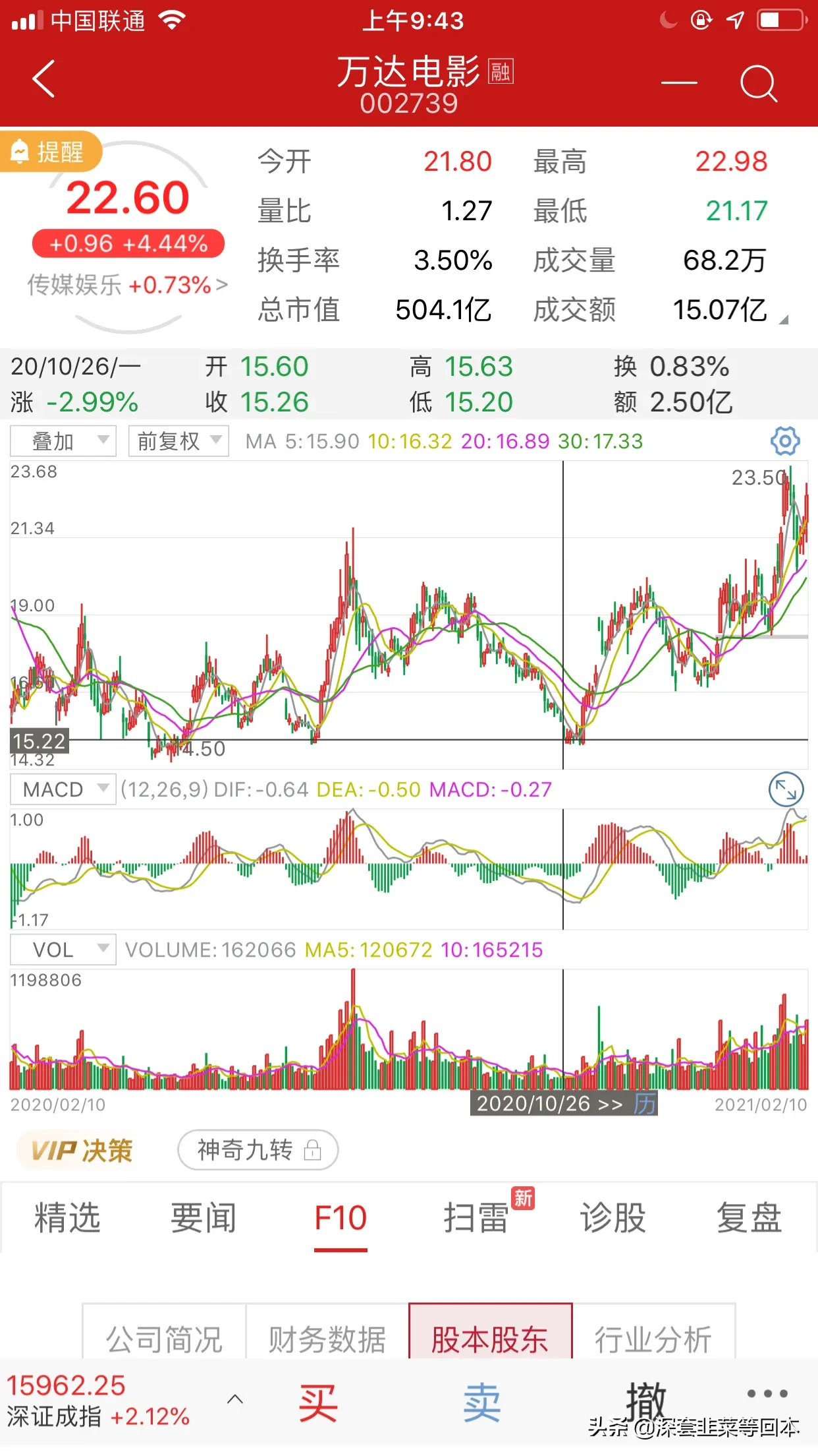 高毅资产2020.10.26入股1.07亿股万达电影成第三大股东,抄底时机真的精准10.26日收盘价15.25元,从最高价92元跌到现在22.6元,现在都说基金抱团高位股,动员散户基民拥抱高位50茅龙头概念股,我看这个进场时机明明时抄底嘛,而且是在影院股业绩巨额亏损时买入的,这时的影视股难道不算是垃圾股吗?