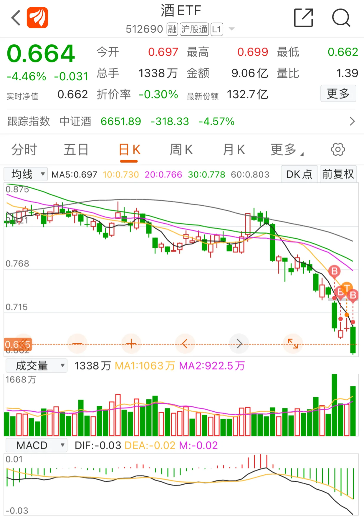 酒ETF:今天茅台盘中跌破1400点,尾盘也拉了回来,1400的茅台还香不香,市值还有1.76万亿,工商银行市值1.51万亿,A股第一市值股是否会易主,昨天做T全抛了以后,收盘又进了一点,今天又补仓了一点