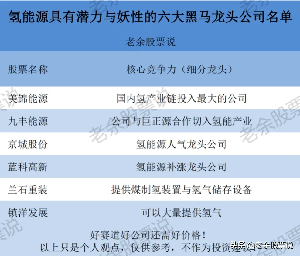 目前氢能源行业高景气度的受益者是美锦能源和九丰能源,具有妖性的公司是京城股份、蓝科高新、兰石重装和镇洋发展。