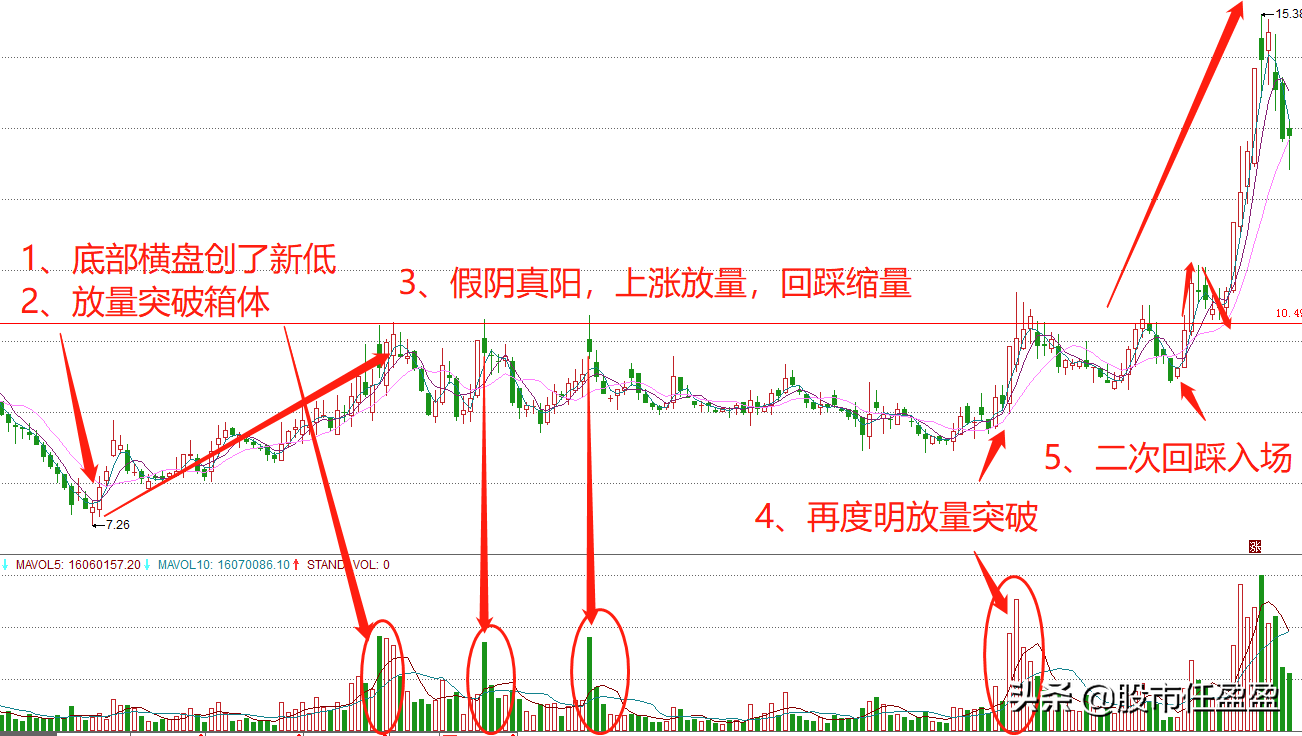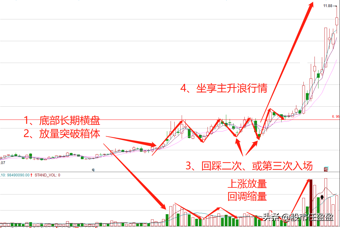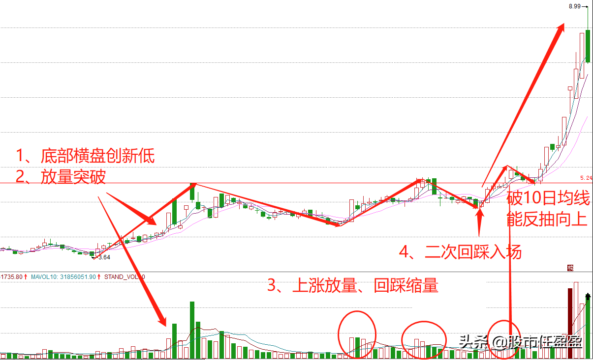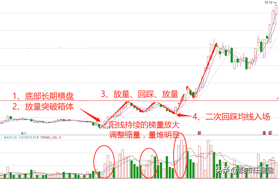 5、介入时机:我们筛选出经过半年以上长时间的横盘打压的股票,股价和成交量萎靡到极致,然后突然出现放量突破横盘整理区间的股票,这种股票会再度出现回踩,稳健一些的话,通常在回踩以后的二次放量大涨之后,二次回踩到10日或20日均线入场。