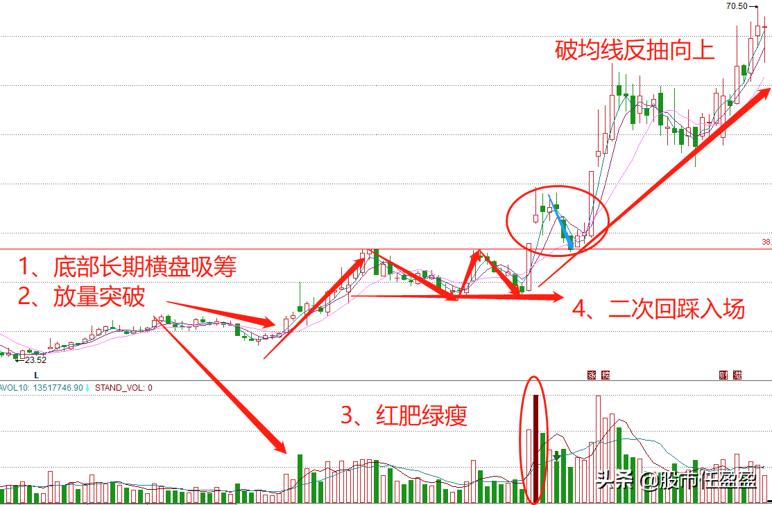 3、此时主力会进入拉升前的再度洗盘,洗掉拉升前,股价抬头过程中追进来的跟风盘,和前期被深度套牢,后期一见股价稍微抬头,扭头就走的套牢盘,此时我们如何识别洗盘呢,记住一个口诀“红肥绿瘦”,也就是上涨放量,回踩缩量。