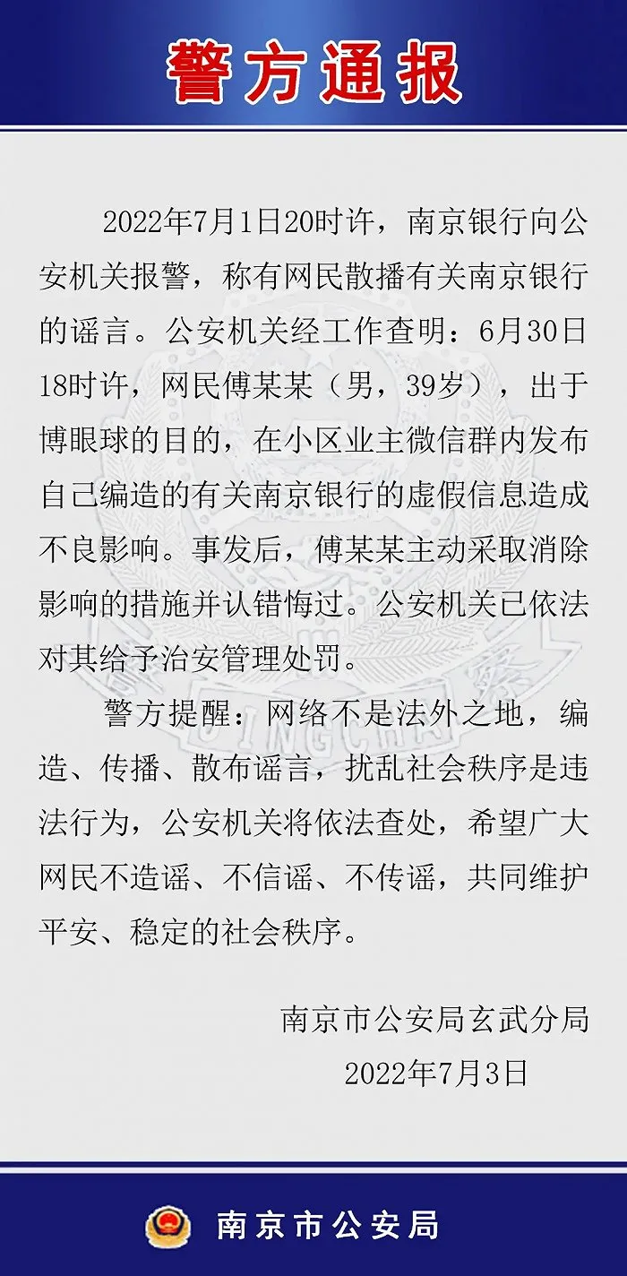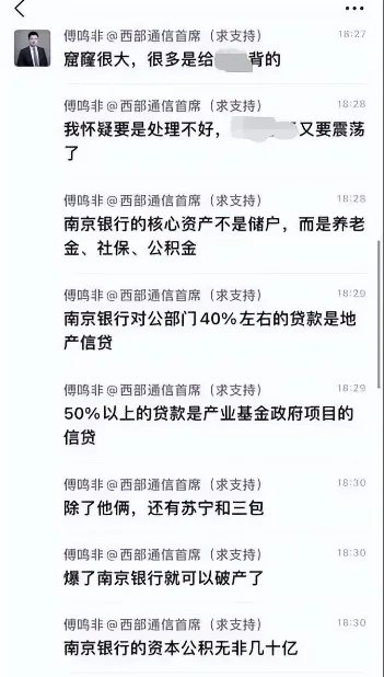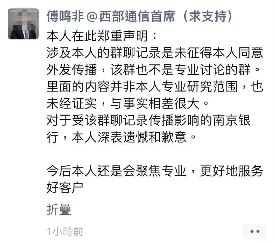 而把漩涡中的南京银行又推了一把的是西部证券的分析师傅鸣非。7月1日,西部证券通信首席傅鸣非发表的关于南京银行的观点,彻底“激怒”了处在舆论旋涡中的南京银行。傅明非本人也陷入舆论漩涡,随后,傅明非在朋友圈发声明致歉。傅明非本人被西部证券除名,公安机关也对其予以治安处罚。发布不实消息的傅明非受到了处罚,但南京银行的真相是什么,我们期待它早日公之于众。信息越透露,越有利于南京银行的发展。越是雾里看花,市场就越发充满了种种推测。头条热榜