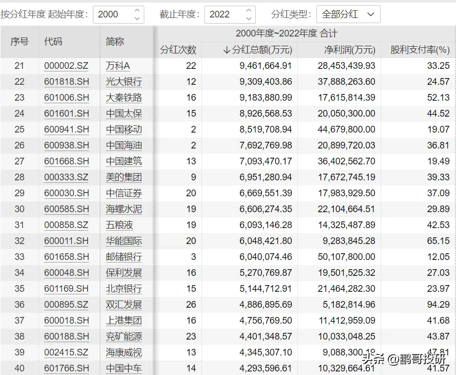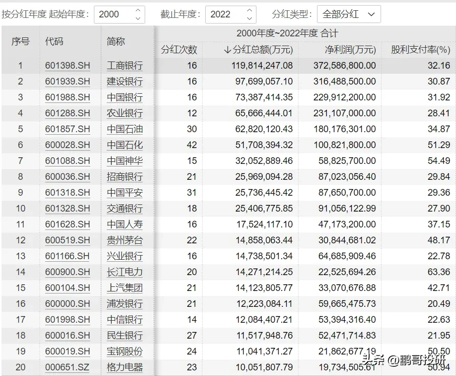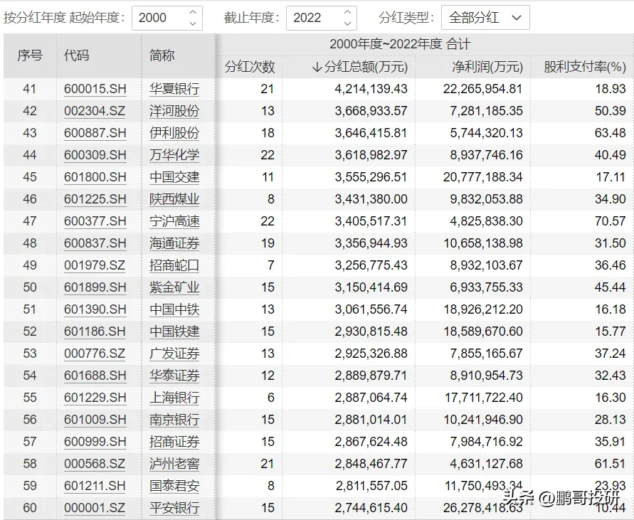 3.中国银行 利润总额2.3万亿 分红总额0.74万亿 分红率32%