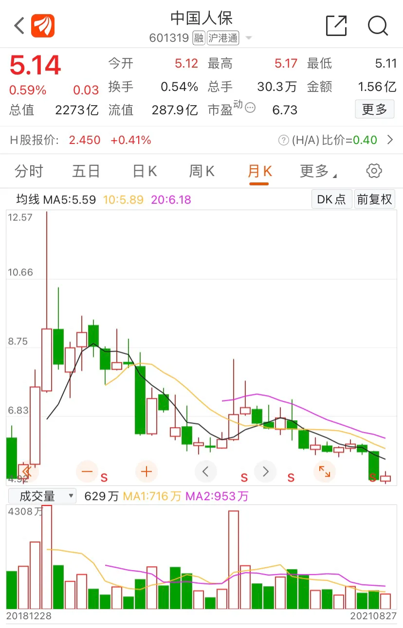 5,中国人保,目前股价5.14元,总市值2273亿元;