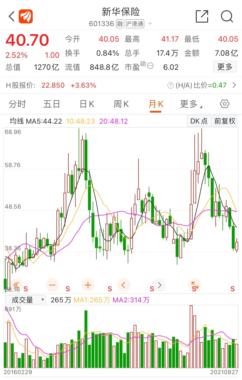 2,新华保险,目前股价40.70元,总市值1270亿元;