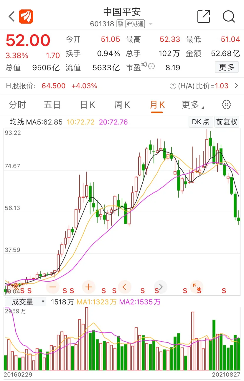 1,中国平安,目前股价52.00元,总市值9506亿元;