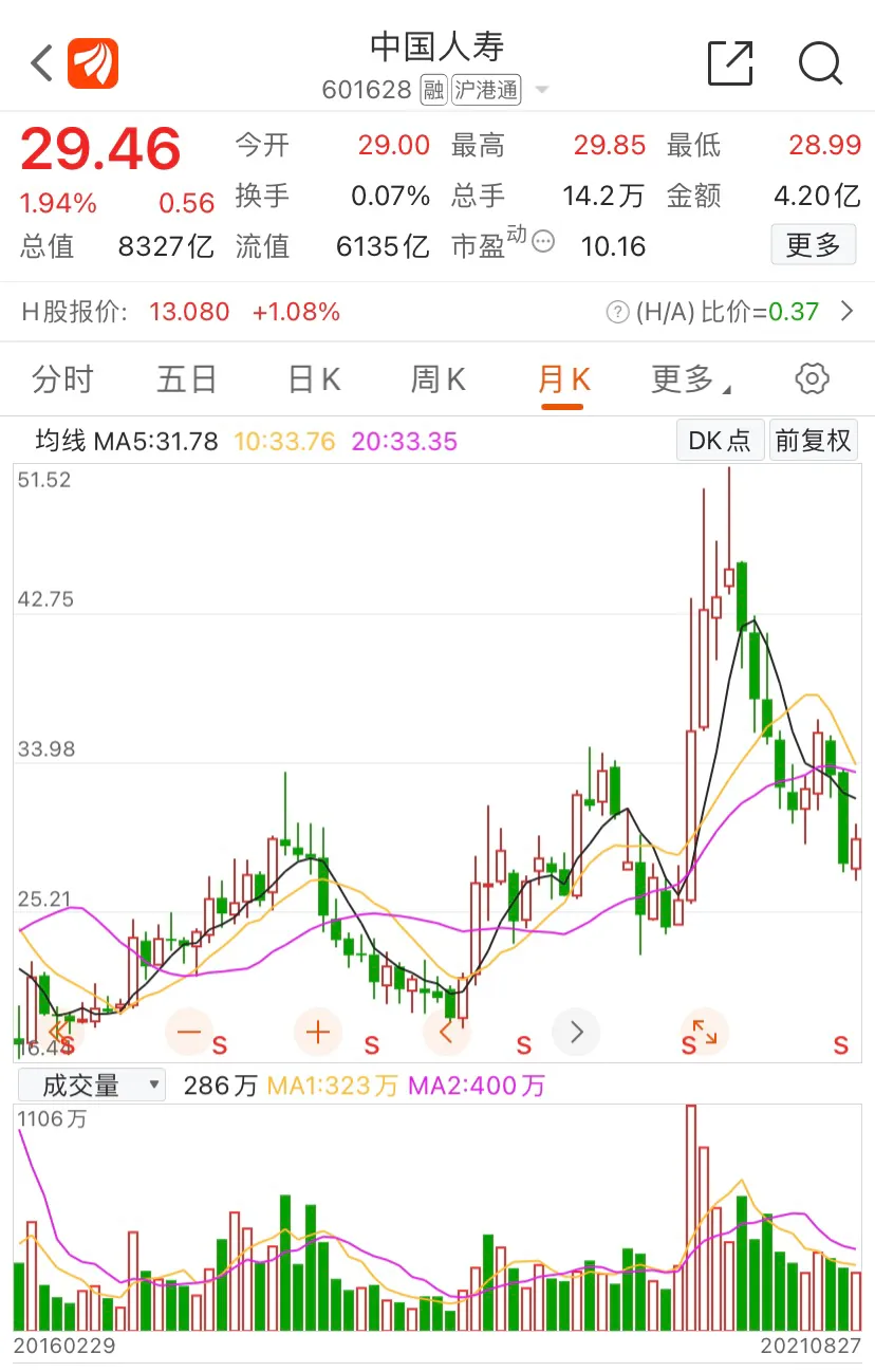 3,中国人寿,目前股价29.46元,总市值8327亿元;