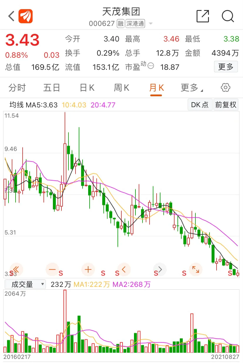 6,天茂集团,目前股价3.43元,总市值169.5亿元;