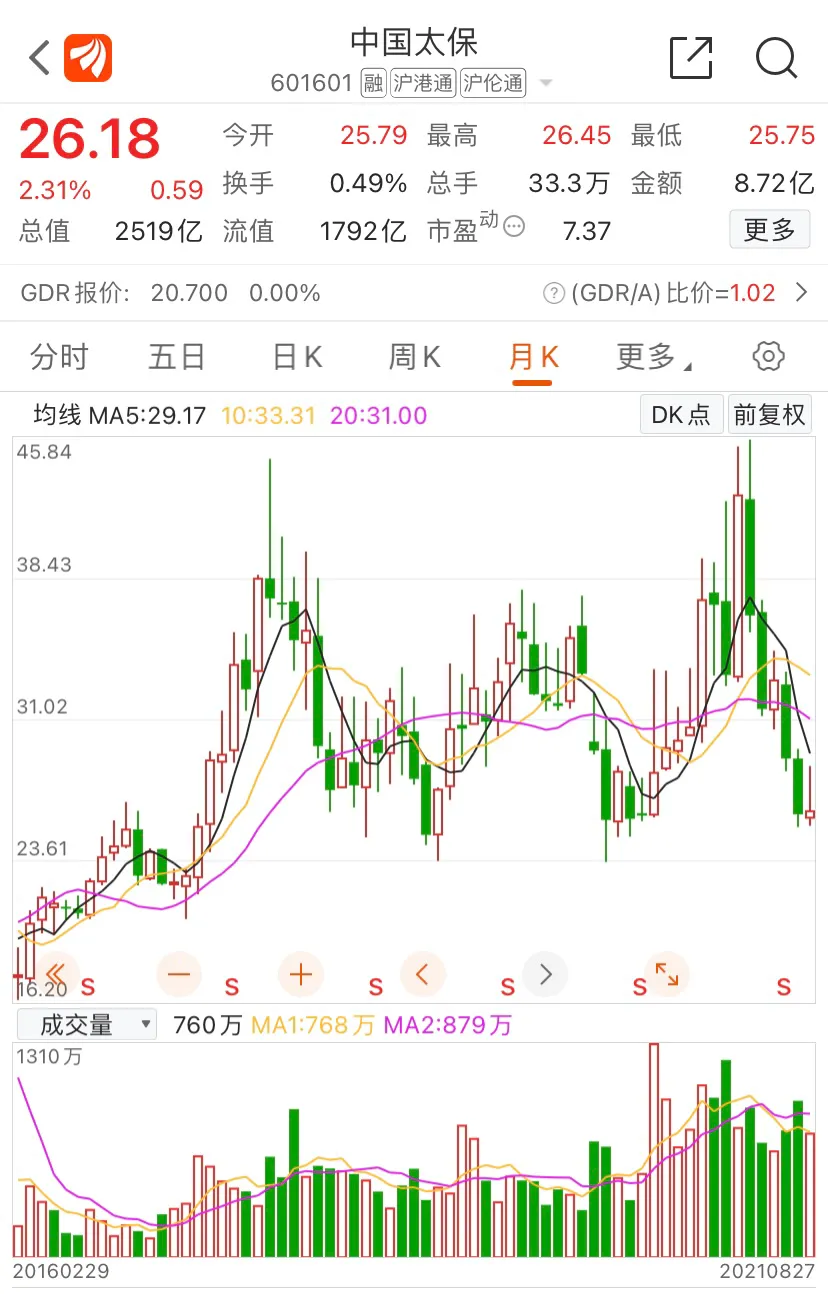 4,中国太保,目前股价26.18元,总市值2519亿元;