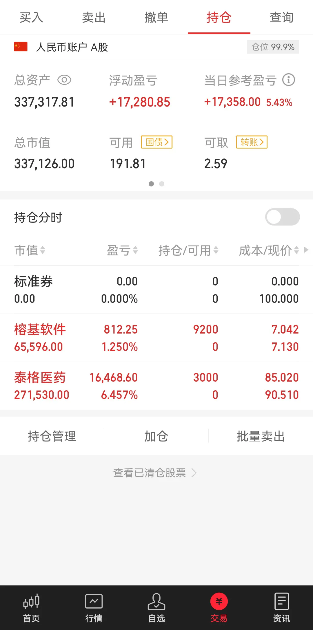 1. 普通账户,由于上周五展开的国债逆回购GC004今日到期解冻,早盘大部分资金于85元买入超跌医药股300347泰格医药,由于早盘股指处于持续上涨中,大部分股票都在上涨没有好的买点,剩余资金只好买入昨日强势今日调整的软件股002474榕基软件,截至收盘两只所持有个股都以获利报收。